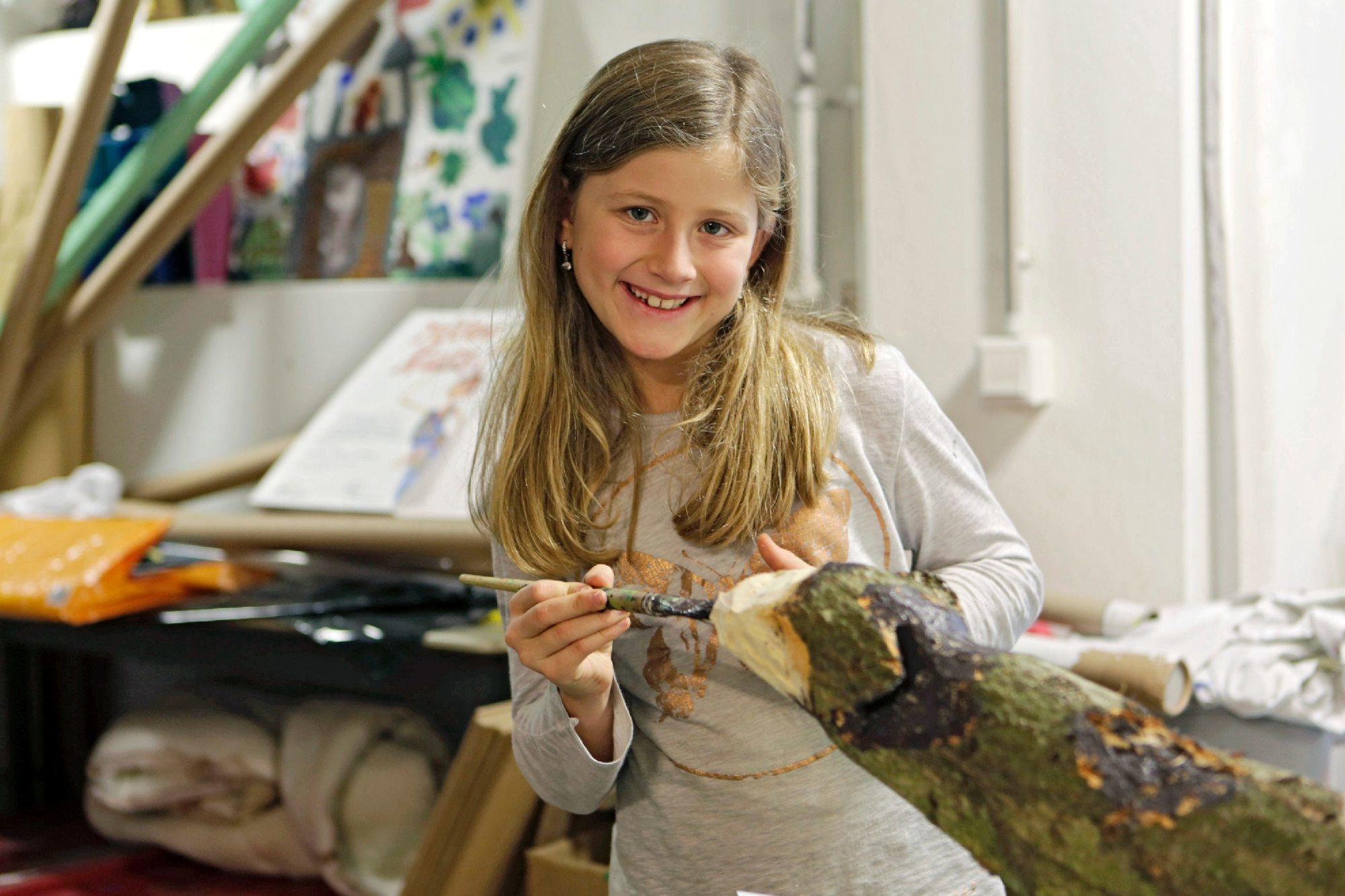 Anna-Lucia hat sich das größte Stück geschnappt und in die Seitenzwinge gespannt. Damit das Mädchen es auch in drei Tagen zu einem Fuchs formen kann, hat Kaynak Vorder- und Hinterfüße bereits herausgesägt. Jetzt muss sie den Schwanz herausarbeiten. „Da hast du aber kräftig gearbeitet“, lobt die Künstlerin. Anna-Lucia ist durch ihren Bruder auf den Kurs aufmerksam geworden. „Außerdem war mir langweilig.“ Wenn alles klappt, möchte sie den Fuchs am Ende ihren Eltern schenken.
