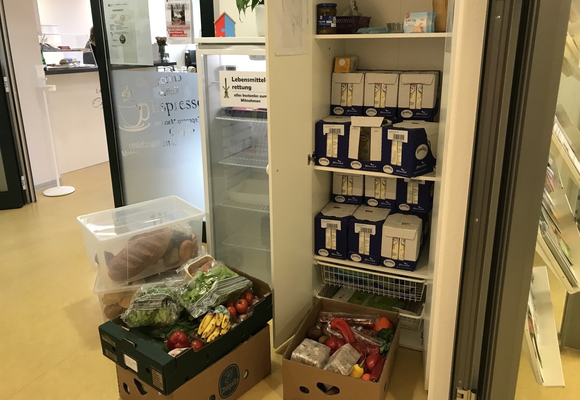 Dirk Schäfer von Foodsharing Rems-Murr-Kreis und sein Kollege haben gerade eine neue Lieferung ins Familienzentrum gebracht und befüllen den Kühlschrank sowie den danebenstehenden Schrank.