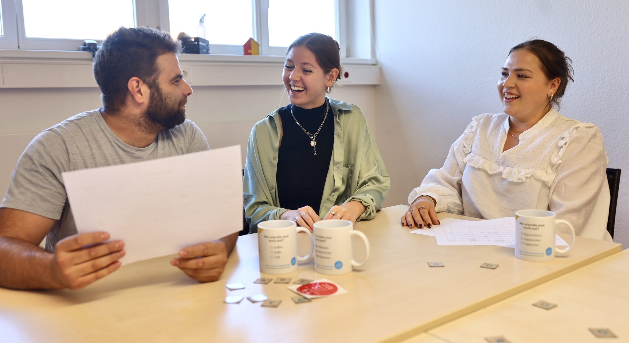 Auf dem Tisch im Familienzentrum Schorndorf steht eine Tasse mit dem Aufdruck „Wie schreibt man... Latte Makiato – Latte Macchiato – Latte Machiato?“. Daneben liegt eine Stofftasche – da steht: „Was kommt in die Einkaufstasche? Spaghetti – Spageti – Spagetti.“ Auf eine spielerische Art und Weise können Menschen, die Schwierigkeiten beim Lesen und Schreiben haben, im „ABC-Café“ im Familienzentrum ihre Hemmschwelle überwinden und Übungshilfe erhalten.