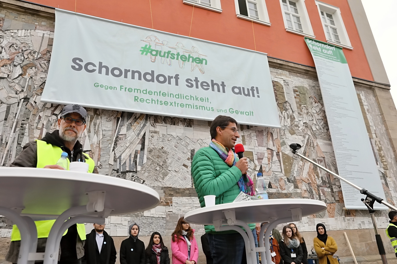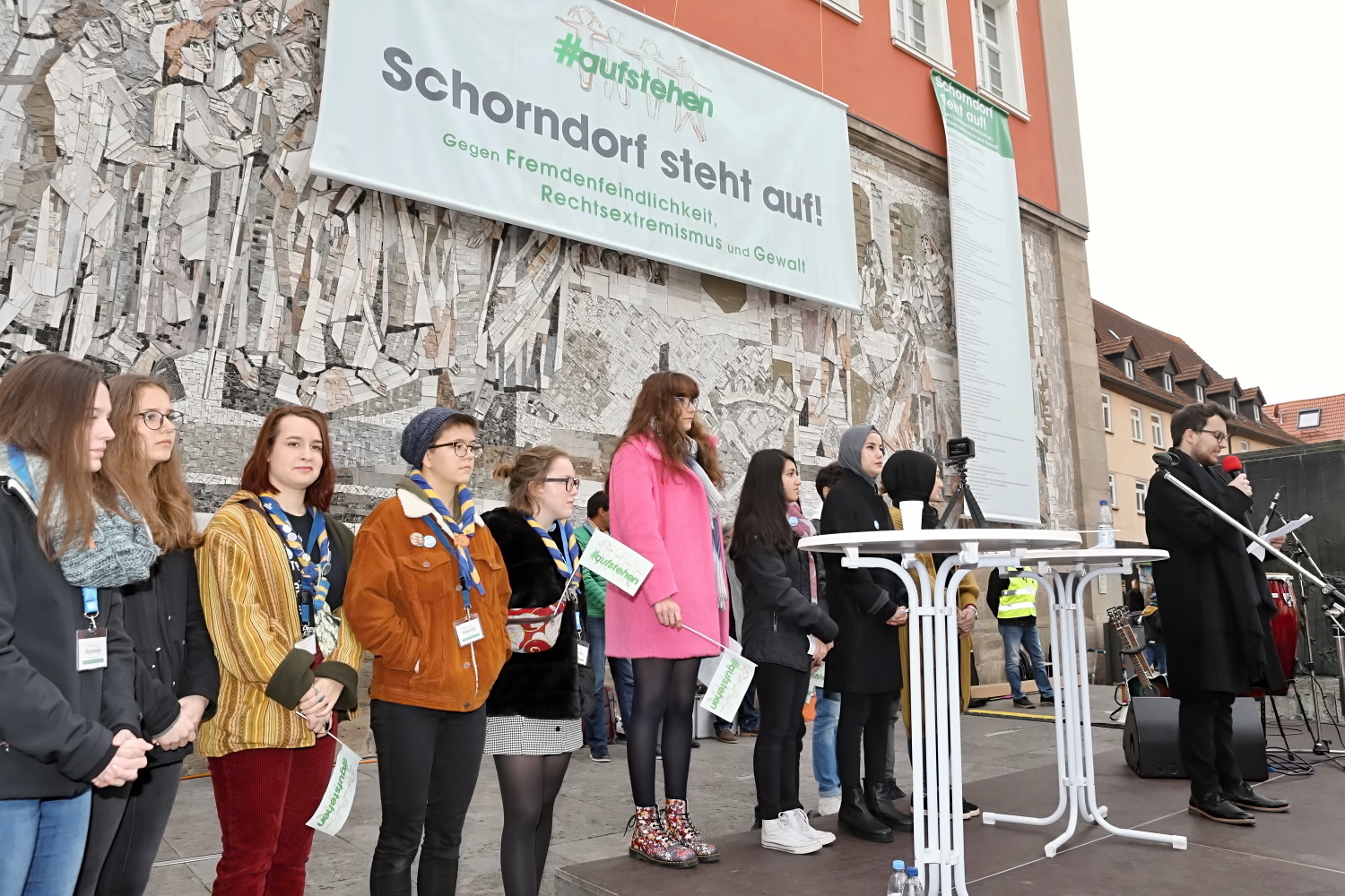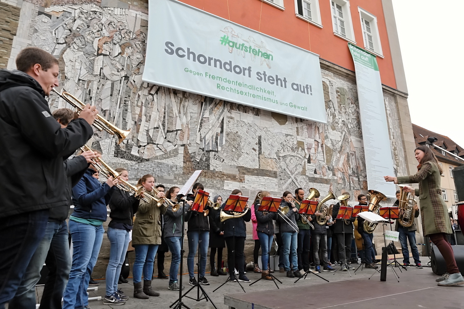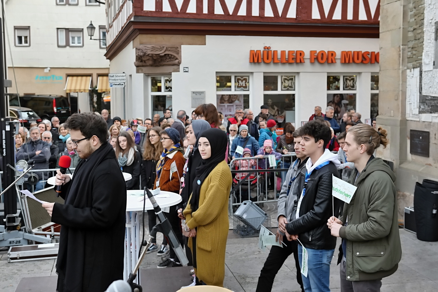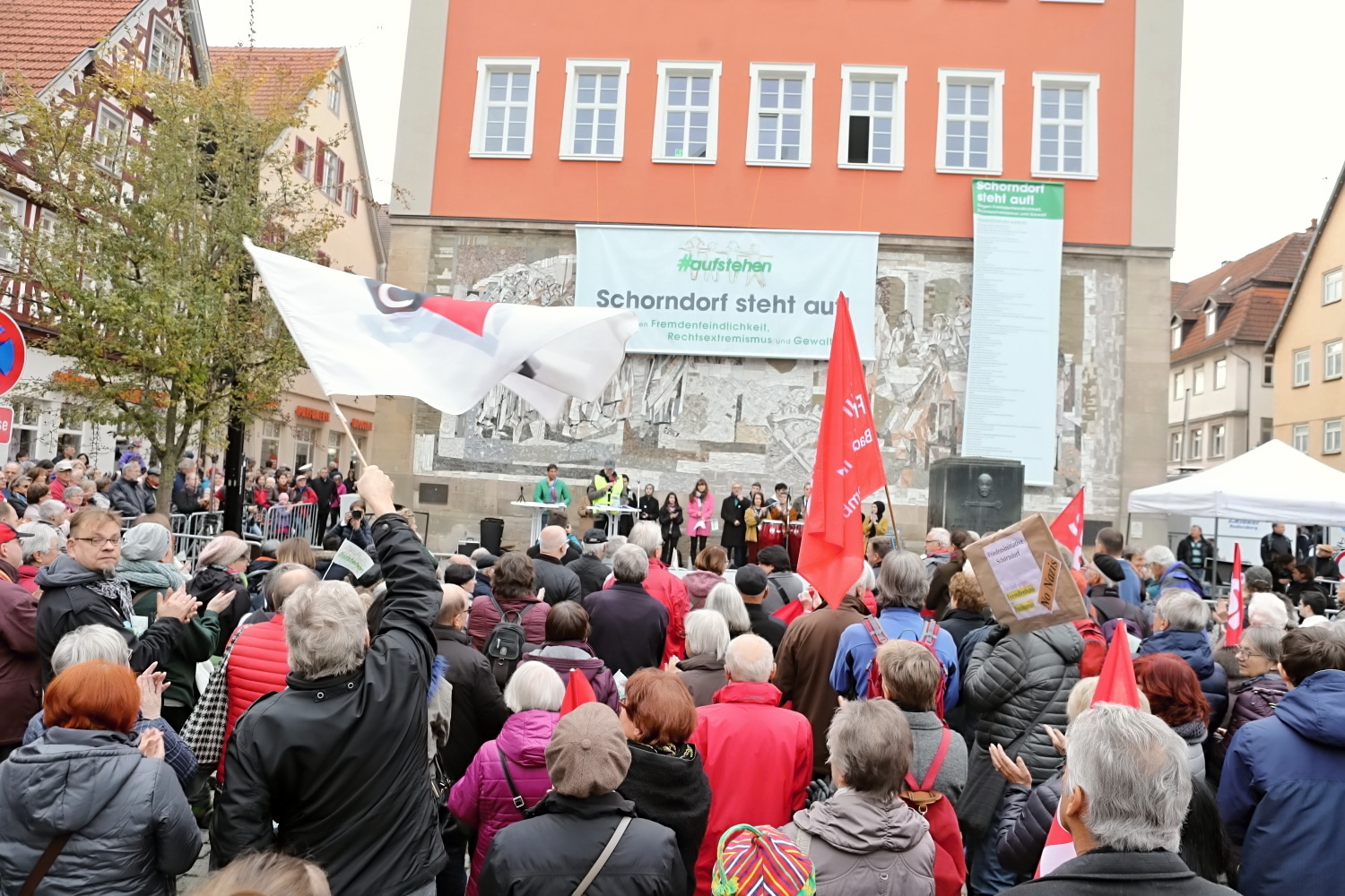 Dass hinter "'#aufstehen" ein breites Bündnis aus der Mitte der Gesellschaft steht, zeigt auch die große Anzahl von Unterstützern: Kaum war die Idee geboren, hatten die Initiatoren fast 100 Bürgerinnen und Bürger, Unternehmer, Vereine und Initiativen hinter sich - "von A wie Abramzik bis Z wie Zauberfaden", wie OB Klopfer in seiner Rede feststellte. Für ihn ist diese große Demonstration ein klares Zeichen gegen Hass und Gewalt: "Das ist ein Tag, auf den Schorndorf stolz sein kann, und der in die Stadtgeschichte eingehen wird."
