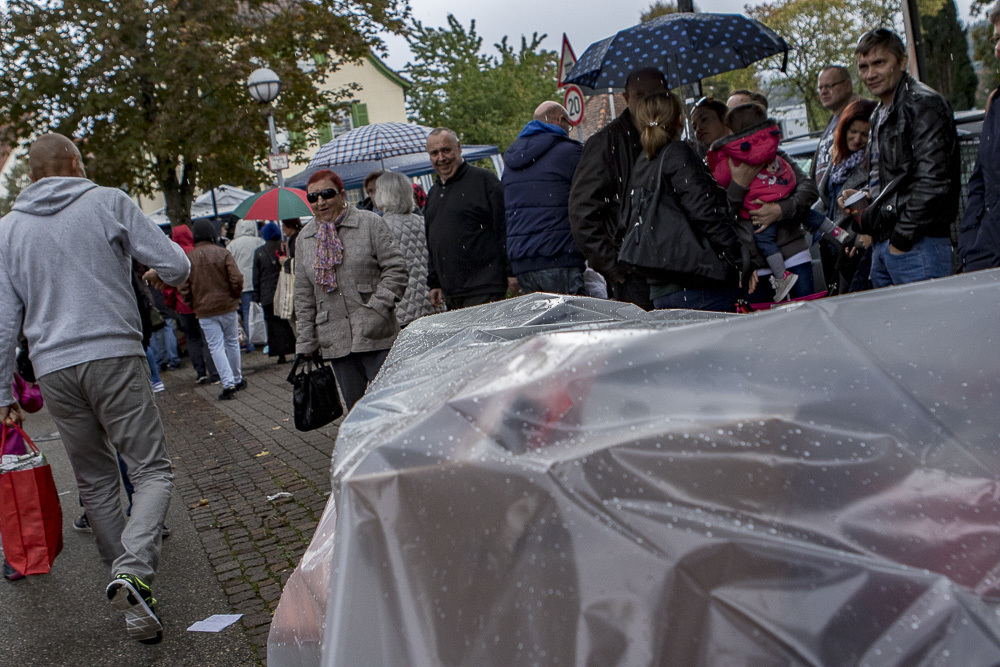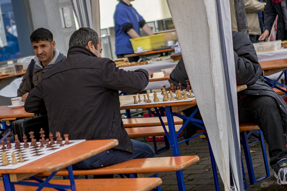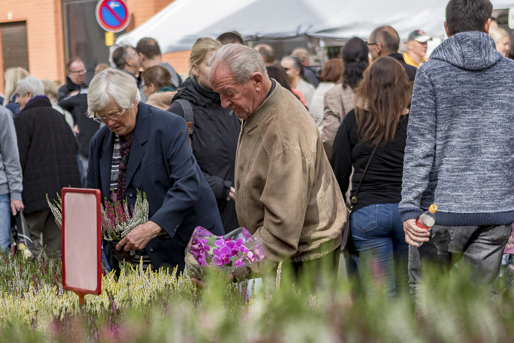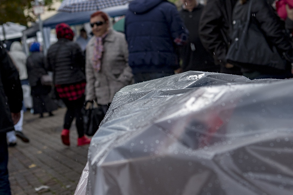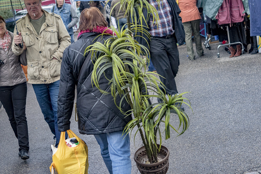 Und da rieben sich dann auf engstem Raum die schrillsten Angebote. „Schrauben, das Kilo für Euro 3,99!“ war so ein unwiderstehlicher Knüller für Männer, demgegenüber ein antikes, allerzierlichstes Pfaff-Nähmaschinen-Tischchen auf eine Liebhaberin wartete. Oder umgekehrt, wer weiß? Überhaupt die Gegensätze. Außer einer kleinen Regenirritation hielt das Wetter. Konnte man im Voraus aber nicht wirklich wissen. So war denn vielleicht an diesem Sonntag zum letzten Mal Gelegenheit, bei einer Gelateria ein Eis zu schlotzen. „Ach guck! Die haben schon Glühwein!“, wunderte sich indes ein Besucher sinnigerweise vorm Stand des auf die Gesundheit der Leute bedachten Deutschen Roten Kreuzes.