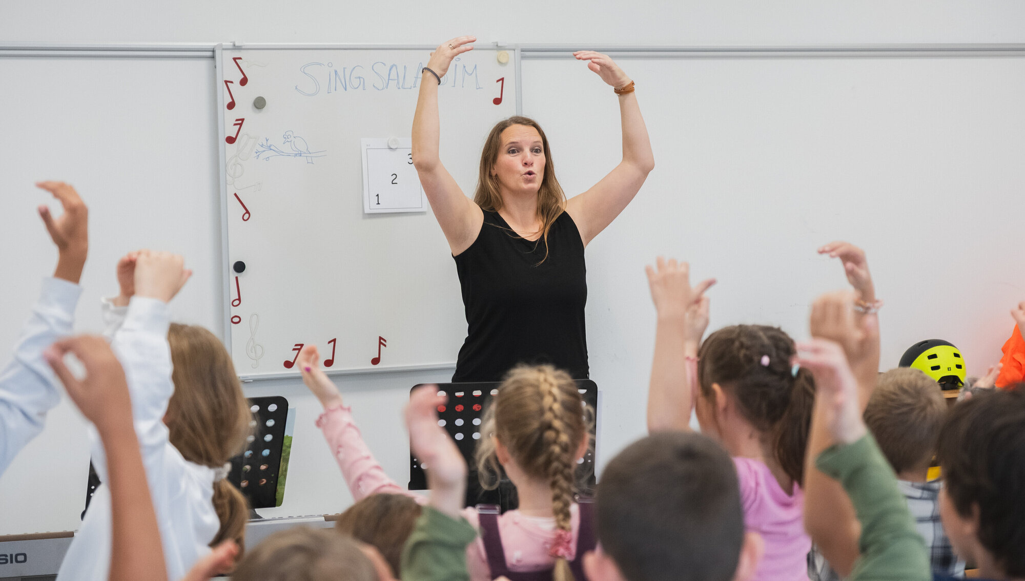Schorndorf.  „Auf einem Baum ein Kuckuck, simsala dim bamba, saladu saladim, auf einem Baum ein Kuckuck saß“ - zarte, leise Stimmchen, die sich vorsichtig an Text und Töne herantasten, sind aus einem Klassenzimmer in der Gemeinschaftsschule Rainbrunnen zu hören. Elena Bautz von der Jugendmusikschule Schorndorf steht anstatt der Grundschullehrerin an der Tafel und vor einem Keyboard. „So. Und noch mal, traut euch ruhig“, sagt sie und bedient eine Taste, um den richtigen Ton