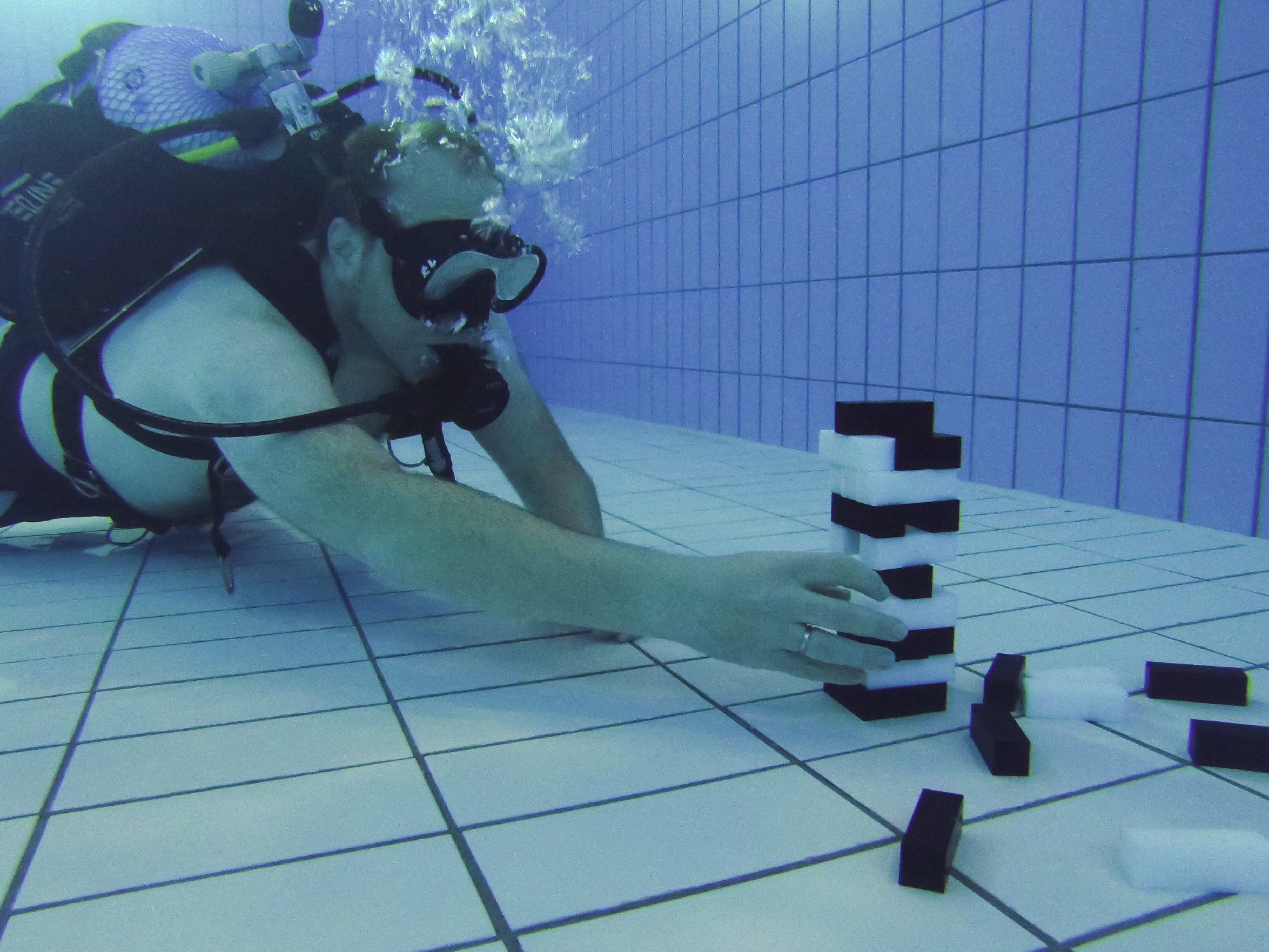 Einmal an den höheren Wasserdruck in der Tiefe gewöhnt, geht es ans Steinelegen. Doch schon vor der ersten Berührung mit der Hand fällt der Turm um. Bei geübten Jenga-Spielern kann eine Partie schon mal eine halbe Stunde dauern. Doch weil der Reporter sich den Steinchen zu ungelenk genähert und dadurch eine ordentliche Wassermenge vor sich hergeschoben hat, ist die erste Runde schon nach einer halben Minute entschieden.