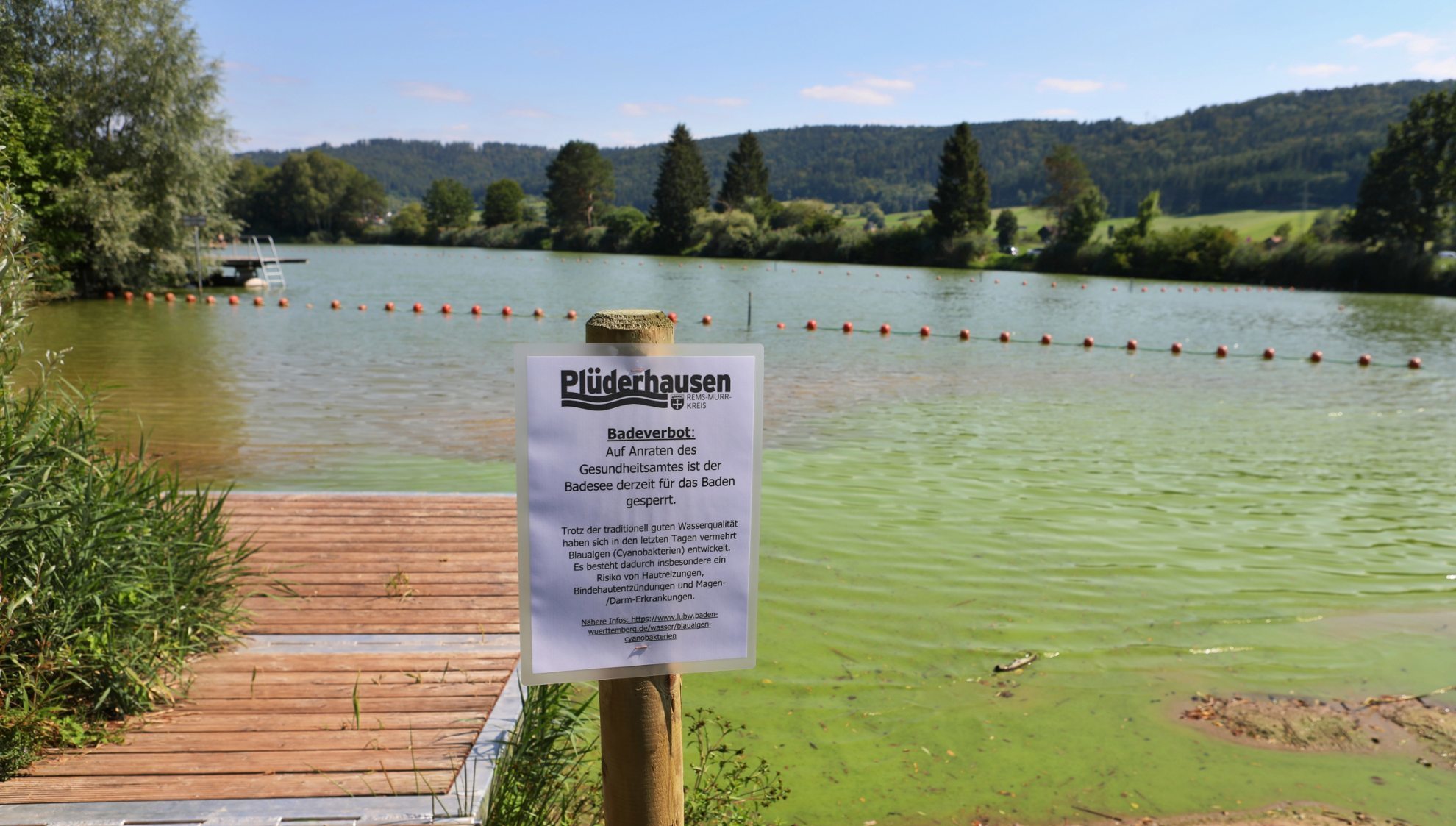Seit Freitag gilt nun das absolute Badeverbot für den ganzen See. Das Gesundheitsamt des Rems-Murr-Kreises und die Gemeinde Plüderhausen informierten darüber per Pressemitteilung und an den Einstiegsstellen mit entsprechenden Hinweisschildern. Das Amt schreibt: „Es wird dringend davon abgeraten, im See zu baden und insbesondere Kinder oder Tiere in den Nichtschwimmerbereich zu lassen.“ Es handle sich um eine Maßnahme auf Grundlage von rechtlichen und fachlichen Vorgaben zum Schutz der Bevölkerung. Der Plüderhäuser Bauamtsleiter Ludwig Kern sagt: „Der Badesee ist ein Natursee, wir können den natürlich nicht einzäunen.“ Er setzt darauf, dass die Leute sich auch so an das Verbot halten: „Wir haben mündige Bürger und mündige Eltern.“