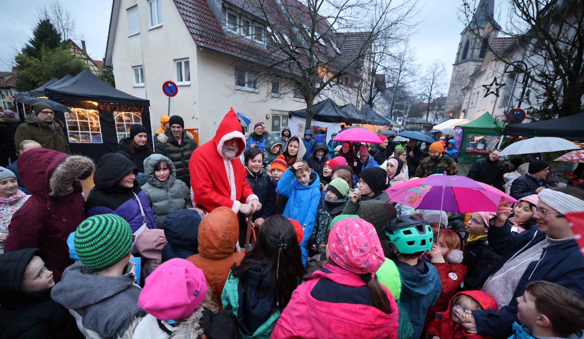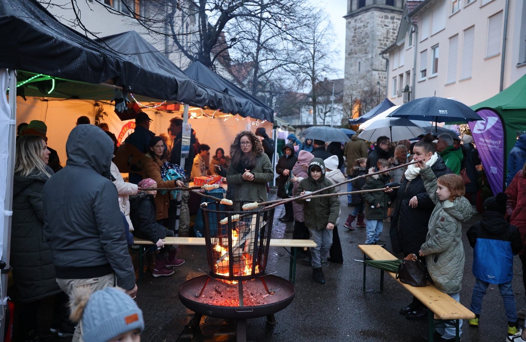 Nieselregen beim Weihnachtsmarkt in Schorndorf-Weiler. Klar, Schnee wäre schöner und vor allem viel stimmungsvoller gewesen. Aber bei zunehmender Dämmerung wurde es dann an den Ständen immer dichter. Die Lichter und ein offenes Feuer zum Stockbrotbraten kamen hinzu. Aus den vielen Punsch- und Glühweingläsern dampfte es in die Höhe. Die Leute trafen sich, man unterhielt sich, labte sich an allerlei köstlichen Leckereien. Kurz: Es wurde richtig gemütlich. Vorweihnachtliche Gefühle kamen