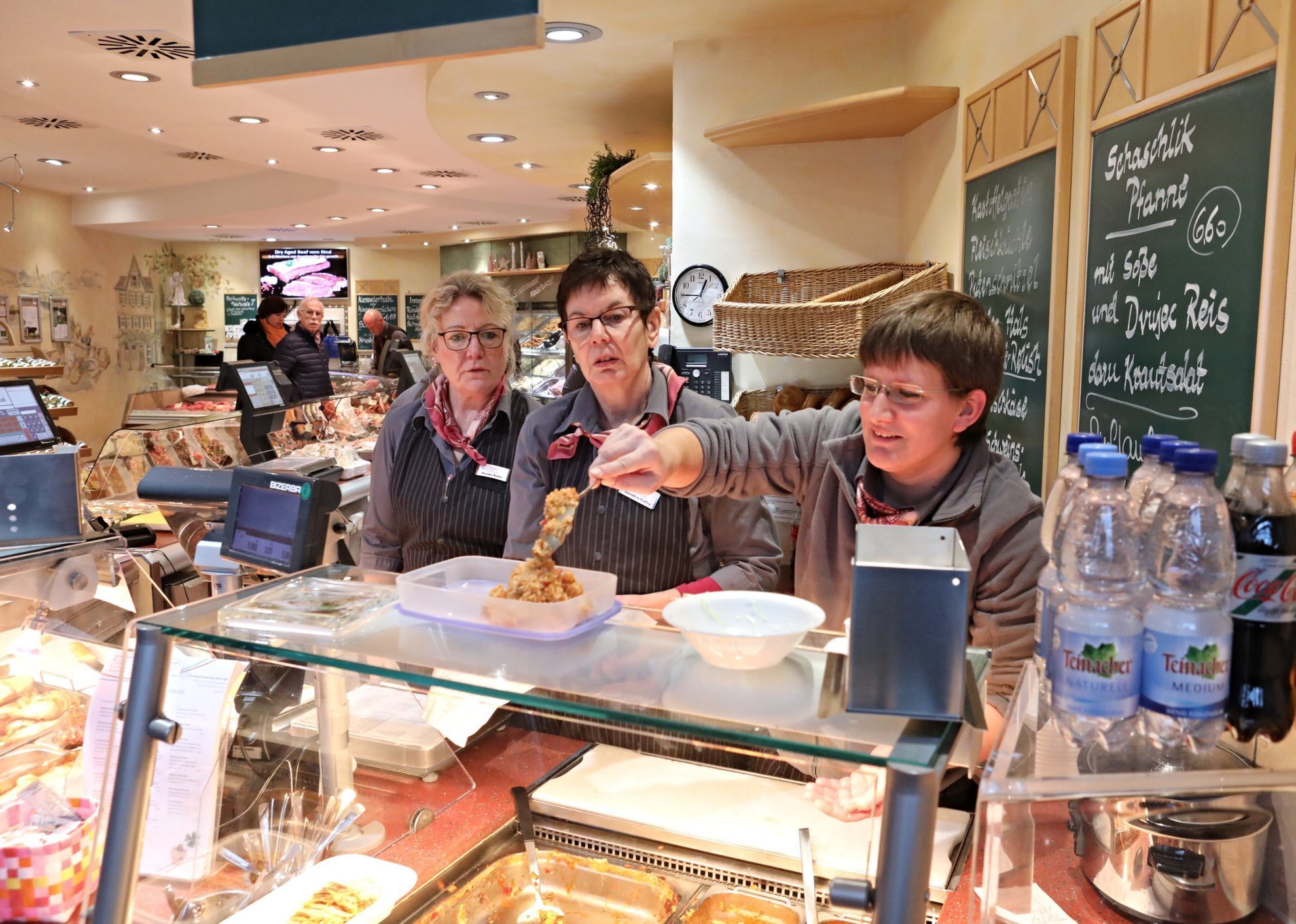 Gefäße, die nicht von den Metzgereien gereinigt sind, dürfen nicht in den sensiblen Bereich hinter der Theke. Bei der Metzgerei Thomas Kurz wird die Regelung beim Mittagessen umgangen, indem die Dosen auf der Theke befüllt werden.