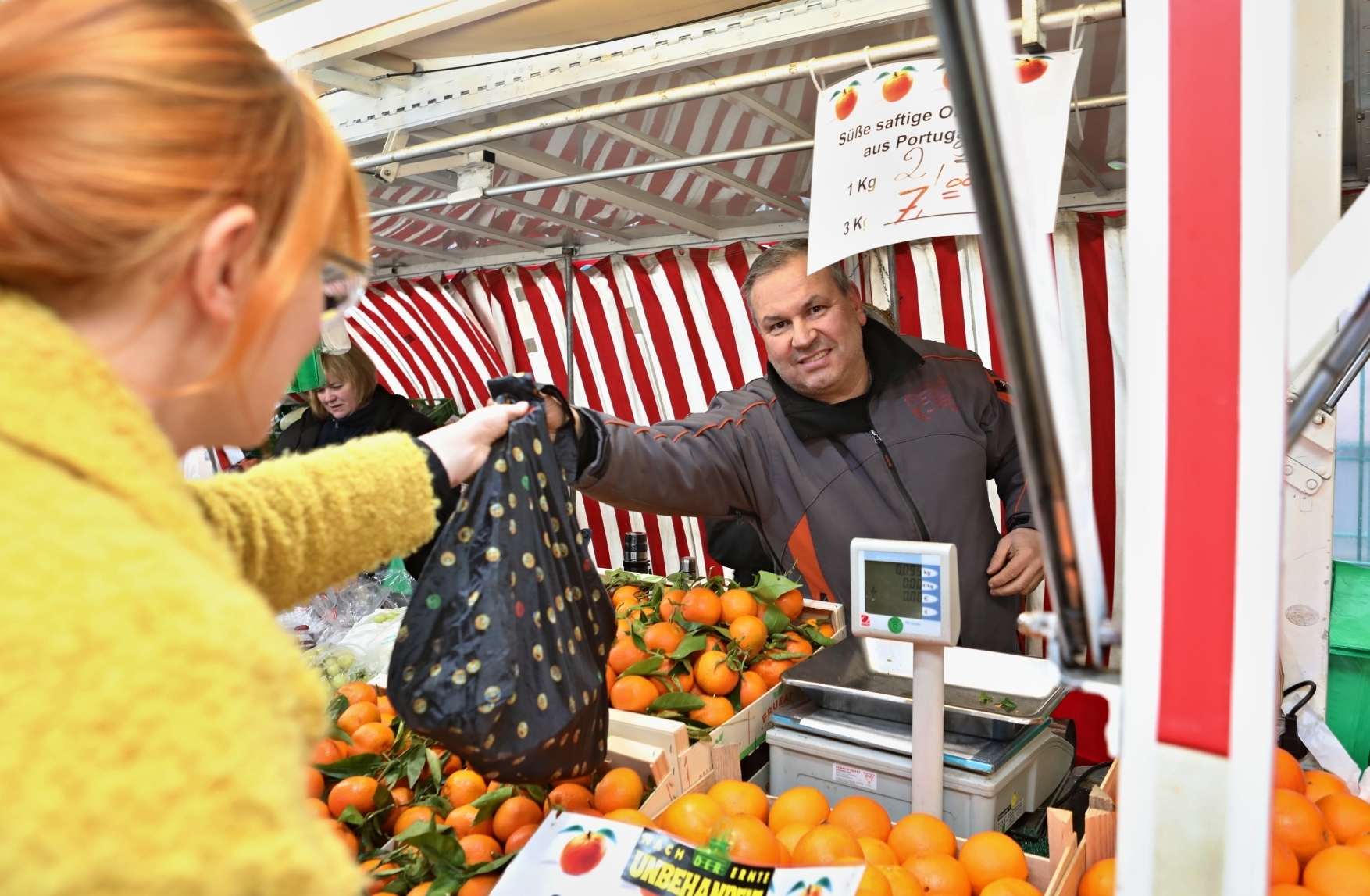 Das ist auch bei einigen anderen Einzelhändlern, wie etwa beim Edeka „E-Center“ möglich. Anstelle von Plastiktüten können die Kunden auch Mehrweg-Gemüsebeutel dort kaufen und verwenden. So wie auf dem Wochenmarkt auch.