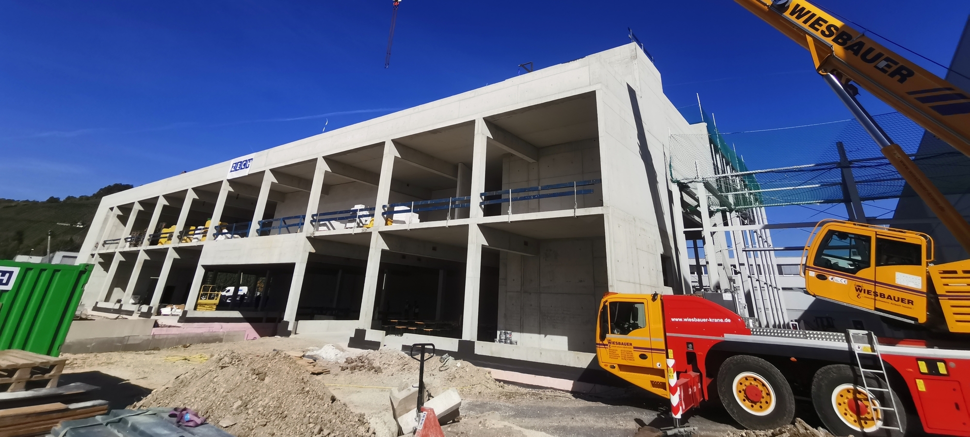 Der Blick auf die Weinberge vom Dach des halbfertigen Hochregallagers bei Catalent ist sensationell, auch die Spätsommersonne hätte für die kleine Feier nicht mehr hergeben können: Mit Verantwortlichen des US-Unternehmens Catalent, der ausführenden Baufirma Zech und Oberbürgermeister Bernd Hornikel wurde das Richtfest beim neuen Hochregallager gefeiert, für das am 6. April der erste Spatenstich gesetzt worden war. „Das Ergebnis kann sich sehen lassen“, zeigte sich Christoph Gritsch,