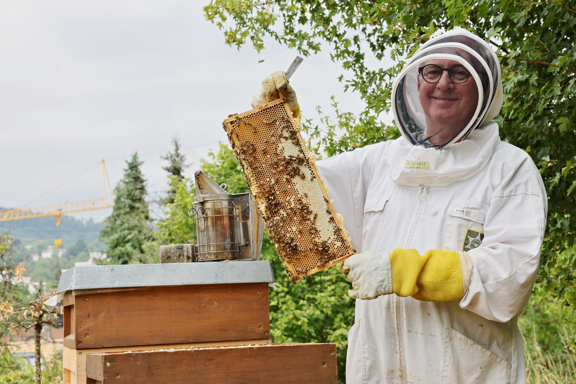 Schorndorf. Hier brummt der Laden, zumindest für gewöhnlich: In den Bienenkästen, die Dieter Trump hier am Hang über Schorndorf unweit des Friedhofs aufgestellt hat, fliegen die Tiere ein und aus, aber mit etwas verhaltener Energie. „Heute haben wir keinen Trachtflug“, beobachtet er. „Sie pausieren so ein bisschen.“ Das kann durchaus von der Tageszeit abhängen. Dieter Trump ermuntert, mit dem Finger eine der verdeckelten Zellen zu durchbrechen: Da quillt der frische Honig