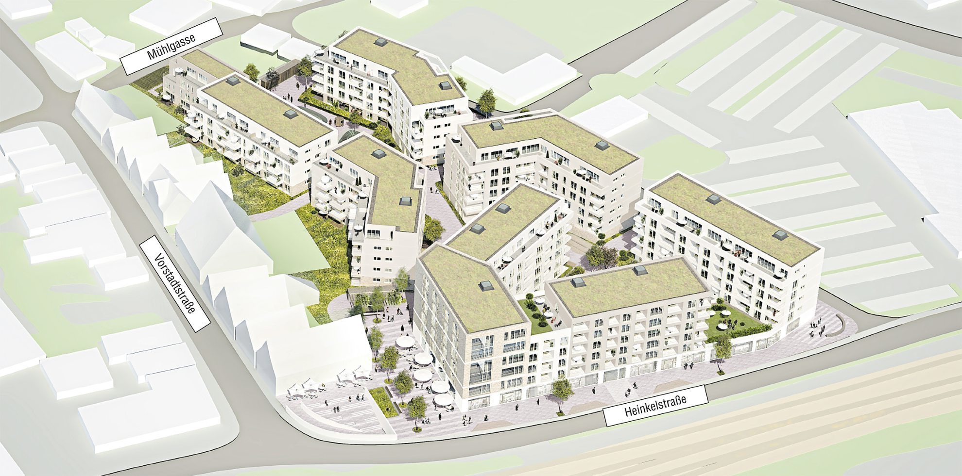 Eine gestalterische Veränderung beim der Heinkelstraße und der Bahn zugewandten Gebäudeteil hat sich Beier zufolge insofern ergeben, als die Fassade geschlossen und auf die zunächst vorgesehenen Öffnungen verzichtet werden soll. Der Wegfall des in früheren Entwürfen enthaltenen Lebensmittelmarktes wirkt sich Manfred Beier zufolge insofern positiv aus, als dadurch im Inneren der Bebauung zusätzliche Platzsituationen geschaffen werden können und eine großzügigere Durchlässig- und Durchgängigkeit erreicht wird. Und natürlich hat sich durch den Verzicht auf einen Lebensmittelmarkt auch die Parkplatzsituation deutlich entspannt.