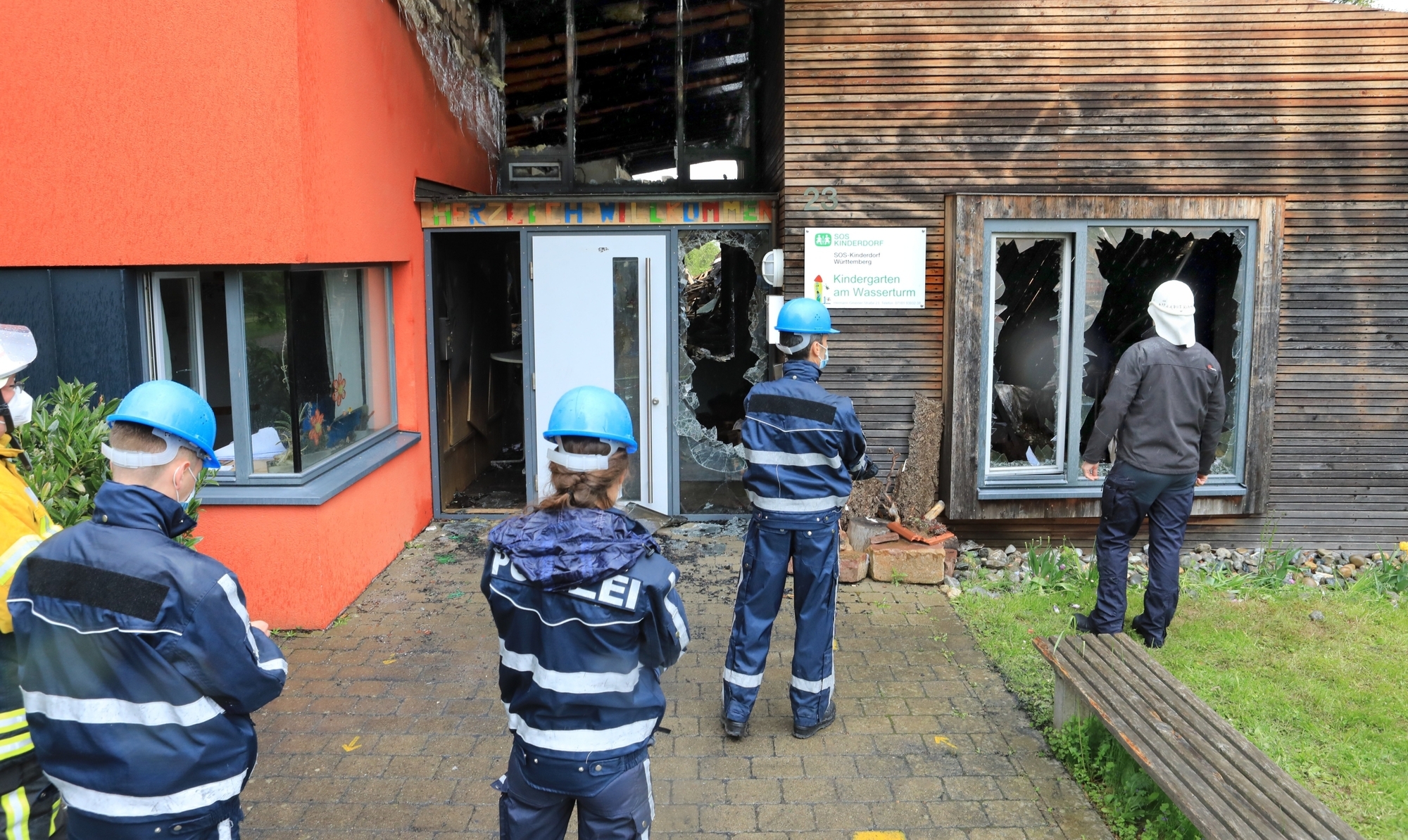 Als die Feuerwehr am Sonntag kurz nach 17.30 Uhr mit zwölf Fahrzeugen und 67 Einsatzkräften im SOS-Kinderdorf in Oberberken ankam, brannte der Kindergarten schon lichterloh. Durch das schnelle Eingreifen konnte zwar verhindert werden, dass der Brand auf angrenzende Gebäude übergriff. Doch schnell war auch klar, dass das im Jahr 2004 eingeweihte Gebäude, in dem viel Holz verbaut ist, nicht mehr zu retten ist. Dafür konnte die Polizei am Montagvormittag mitteilen, dass es am Einsatzort