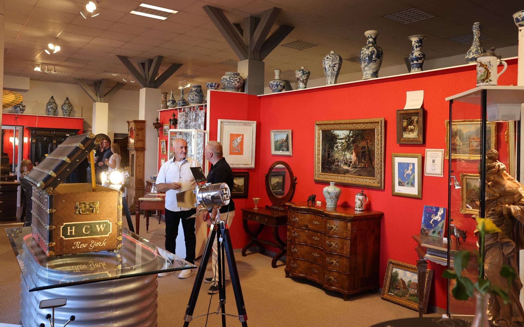 Moderne und alte Kunst, Vasen, antike Möbel und allerlei ausgefallenen Trödel und Sammlerstücke hat der Kunst- und Antiquitätenhändler Kurt Krockenberger in den alten Güterbahnhof geholt. Hinter der eingezogenen roten Wand stehen alte Schränke, Tische und Stühle und warten darauf, restauriert zu werden. „Wir verkaufen im Auftrag“, erklärt Kurt Krockenberger. Für den Verkauf berechnet er 20 Prozent des Erlöses, 80 Prozent gehen an den Besitzer.