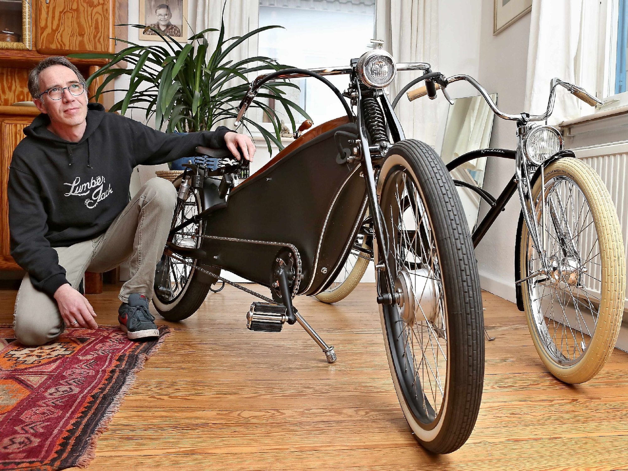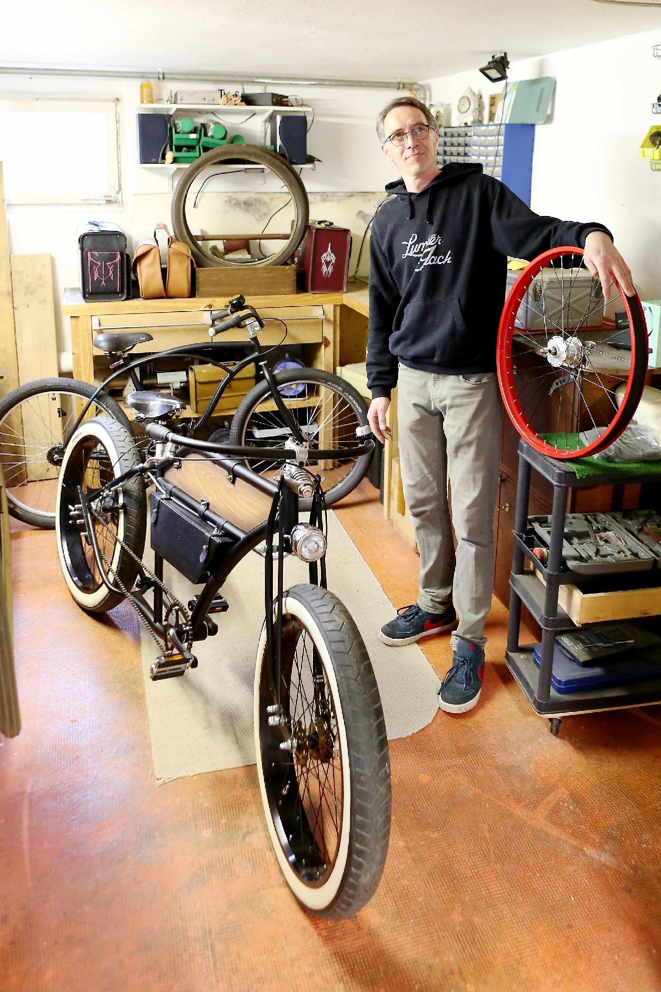 Schorndorf-Weiler. Jan Thiemann ist fahrradverrückt. Im Grunde schraubt er an Zweirädern, seitdem er sich auf dem Sattel halten kann. Erst hat er sich auf Allerweltsräder konzentriert. Seitdem er mit seiner Restesammlung nichts anderes anzufangen wusste, als ein langgestrecktes, rotes Fahrrad zusammenzubasteln, hat der 48-Jährige eine neue Lieblingskombination: Nach Maß gebaute Cruiser mit E-Motor dürfen auch gerne in seinem Wohnzimmer in Weiler stehen.