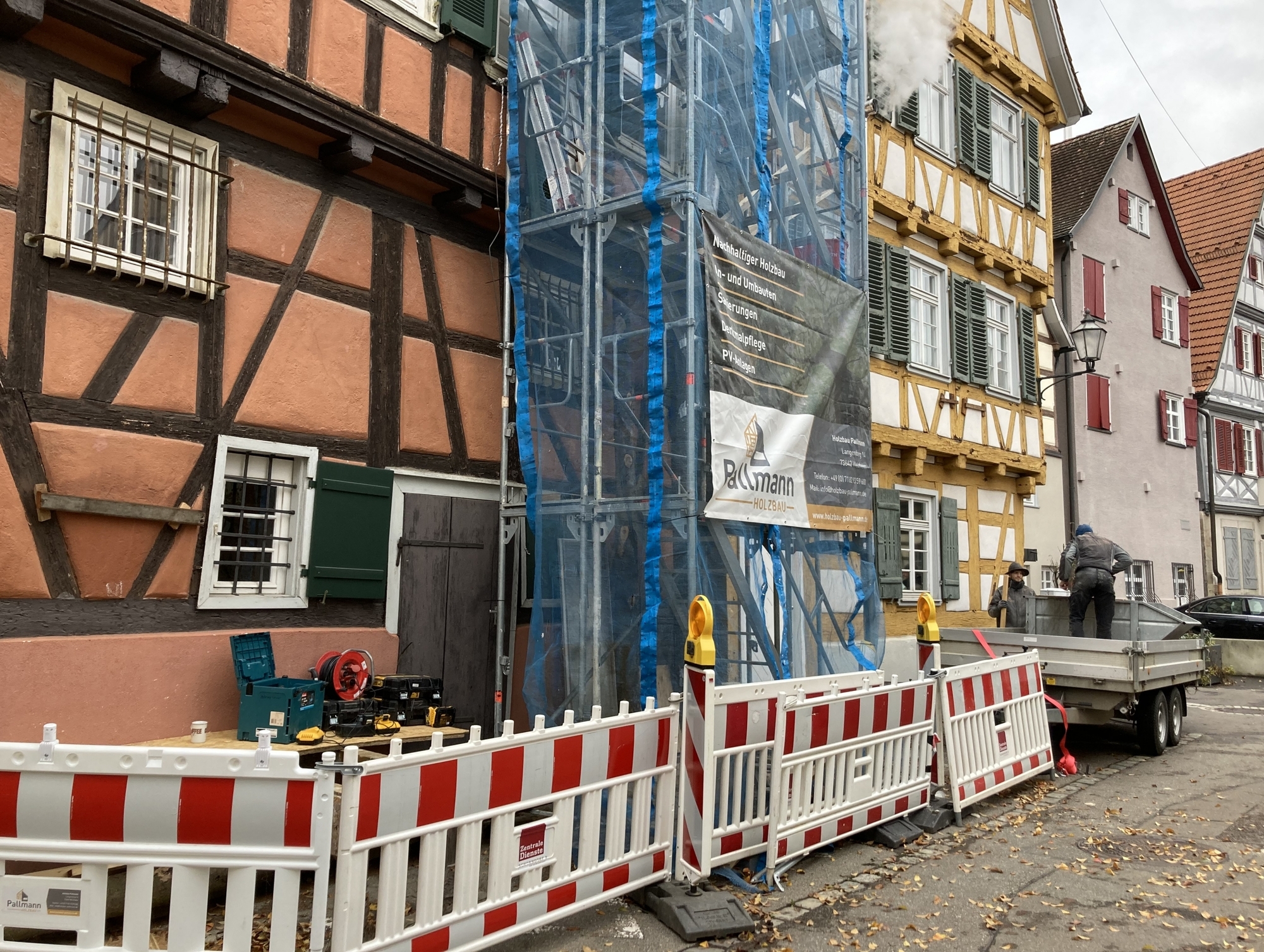 Dass die Fachwerkgebäude, in denen sich das Schorndorfer Stadtmuseum befindet, marode sind, ist schon seit Jahren bekannt und mittlerweile in der Haushalts- und Finanzplanung der Stadt auch eingetaktet: 2025 soll die Planung beginnen, die Sanierung des Gebäudes Kirchplatz 7 in den Jahren 2026 und 2027 folgen. Dass aktuell an der Ostfassade des Gebäudes Kirchplatz 9 Holzbalken und Gefache ausgetauscht werden, ist eine andere Baustelle: Obwohl die Stadt dieses Gebäude lange in einem besseren