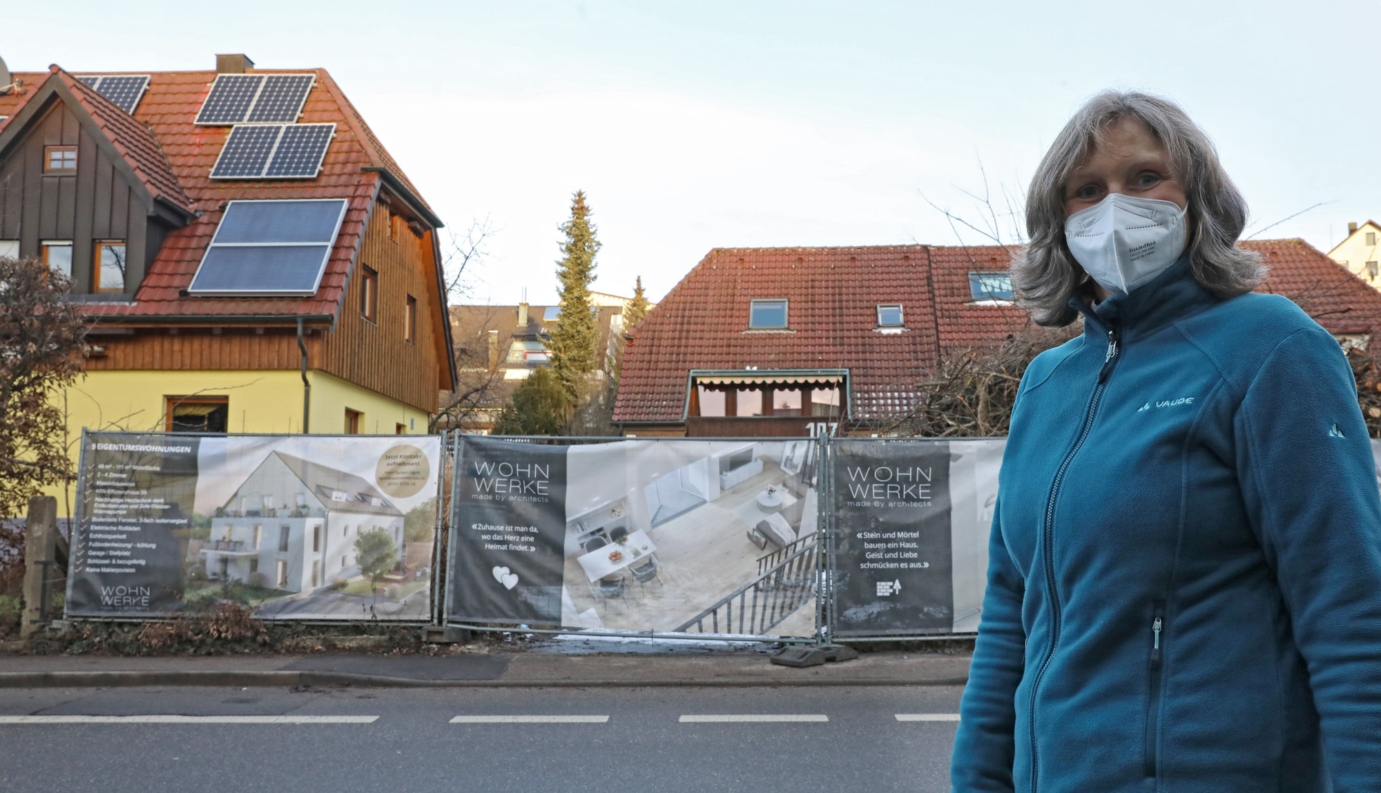 Vor dem Haus die vielbefahrene Straße, doch dahinter liegt ein schöner Garten, der sich auf dem Nachbargrundstück bis hoch zur Hungerbühlstraße erstreckt. Seit 25 Jahren wohnen Silke Bürger-Kühn und ihr Mann in dem gelben Einfamilienhaus an der Uhlandstraße. Gegen neue Nachbarn haben sie nichts einzuwenden. Doch sie sind nicht einverstanden, dass die Wohnwerke GmbH aus Remshalden mit einem massiven Neunfamilienhaus so nah an sie heranrücken will, dass sie befürchten, sich künftig „wie in