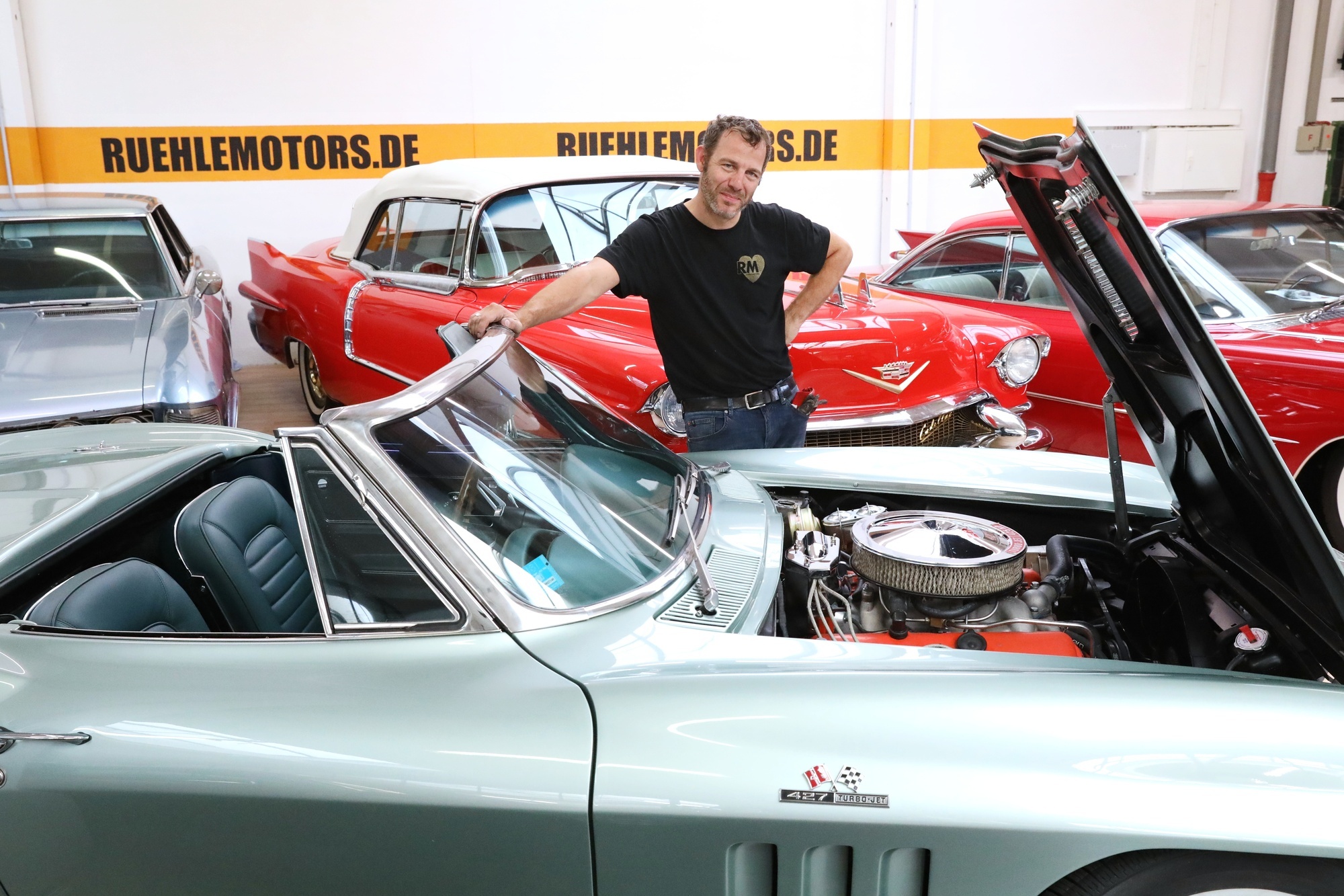 Zahlreiche amerikanische Oldtimer, darunter ein blau lackierter Chevrolet Elcamino oder ein rot-weißer Eldorado Biarritz, stehen im Showroom des 45-Jährigen.