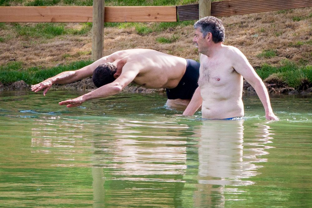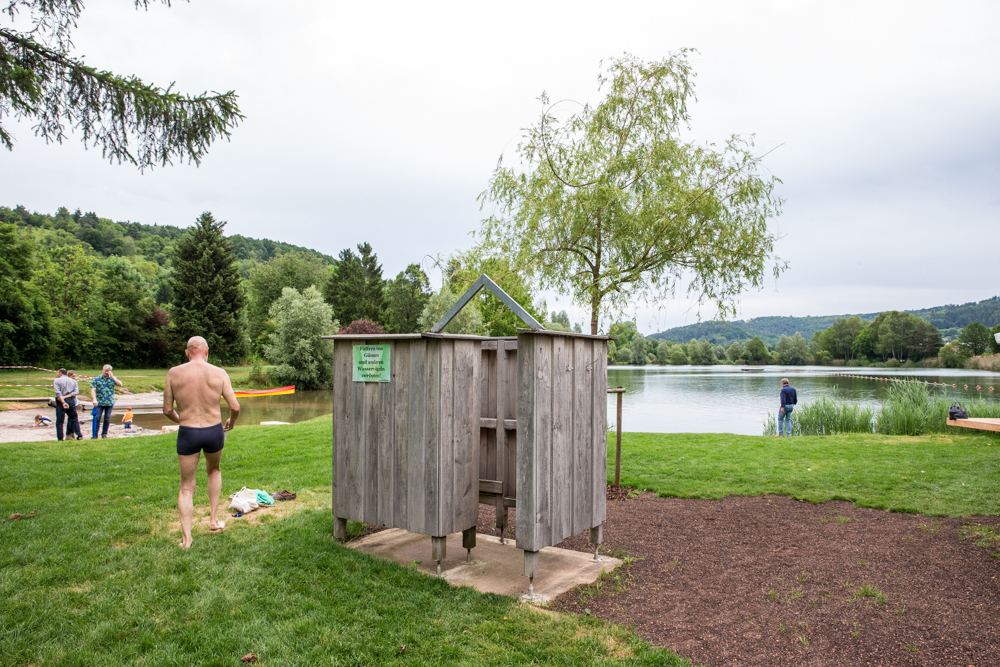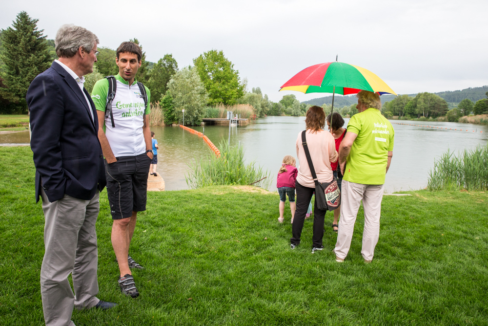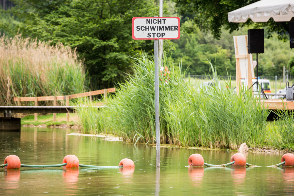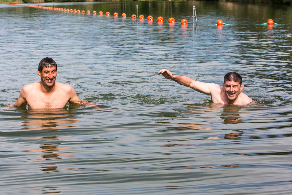 Am Freitag bei der Feier meinte es Petrus nicht besonders gut, was den Plüderhäuser Schultes zu der Aussage veranlasste, bei Regen im Badesee zu schwimmen, habe auch seine Qualität. Aber eine Einweihungsfeier bei Regen, das sei nicht so toll. Dennoch ließen es sich Andreas Schaffer und der Schorndorfer Oberbürgermeister Matthias Klopfer nicht nehmen, nach dem offiziellen Akt im Badesee zu schwimmen. Da regnete es aber auch nicht mehr.