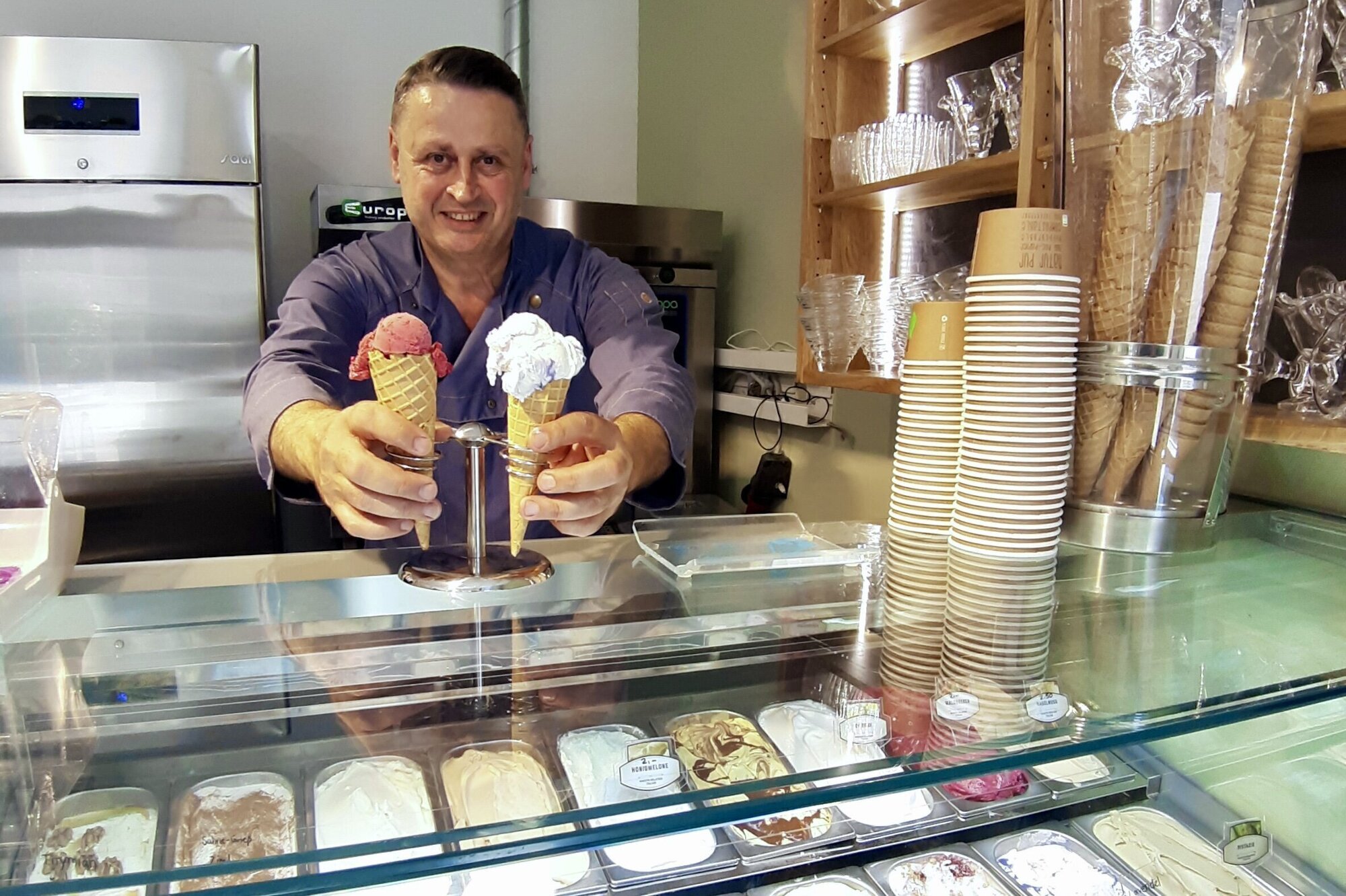 Schorndorf. Lieber eine Kugel Joghurt-Thymian mit Honig und Walnuss oder eine der Sorte Ananas-Salbei probieren? Beides ist besser. Bei Alfred Isak fällt die Auswahl nämlich schwer. Der Eismacher hat am Freitag (8. August) „Alfreds Eismanufaktur“ am Marktplatz 12 in Schorndorf eröffnet. Freunde der kalten Leckerei kennen ihn bereits aus Winterbach, wo er im „Waschhäusle“ „Alfreds Eismanufaktur - Mein Lieblingseiscafé“ betreibt und in der Brunnengasse eine Tapas-Bar