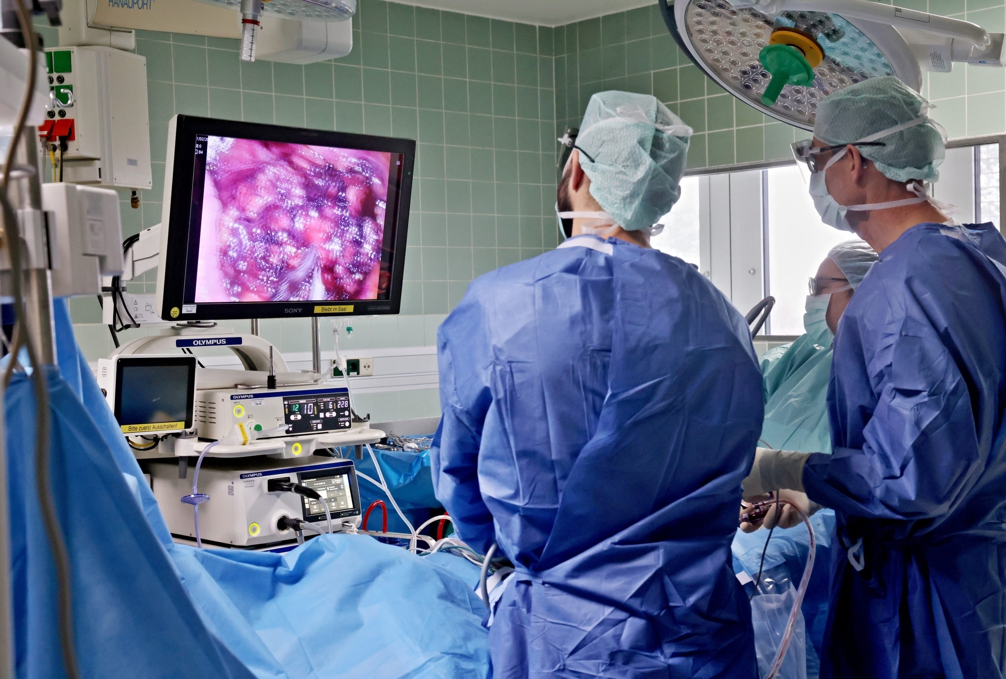 Ein Riesenschnitt mit dem Skalpell und ganz viel Blut: So stellt sich der Laie eine Darmkrebs-Operation vor. Die Realität im OP-Saal der Viszeralchirurgie am Klinikum Schorndorf sieht an diesem Morgen anders aus – ist aber nicht weniger spektakulär. Statt mit einer Operation am offenen Bauch wird der Tumor eines Patienten mit der Schlüsselloch-Chirurgie schonend entfernt. Vier kleine Schnitte, ein dünner Haken mit Elektroden, eine Kamera und ein 3-D-Bildschirm ermöglichen Romed Kühn,