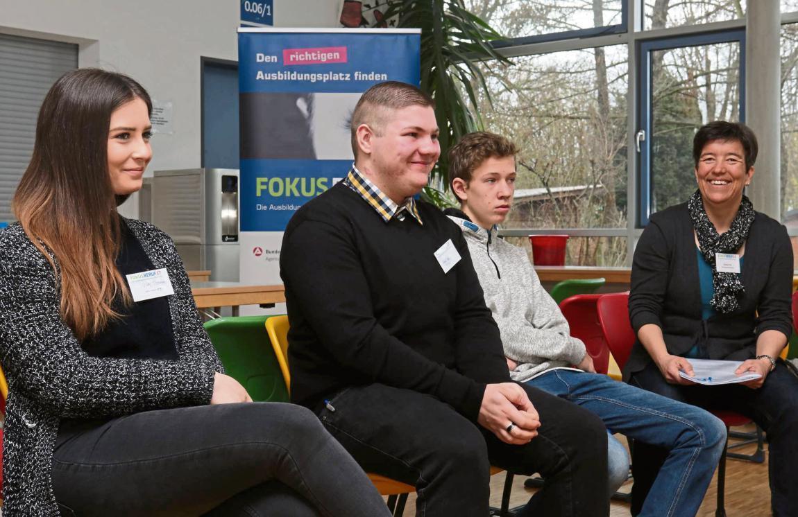 Vier auf einem guten Weg: Viki Tseanko, David Vajda und Jan Meier mit Berufseinstiegsbegleiterin Daniela Fritz. © Habermann / ZVW