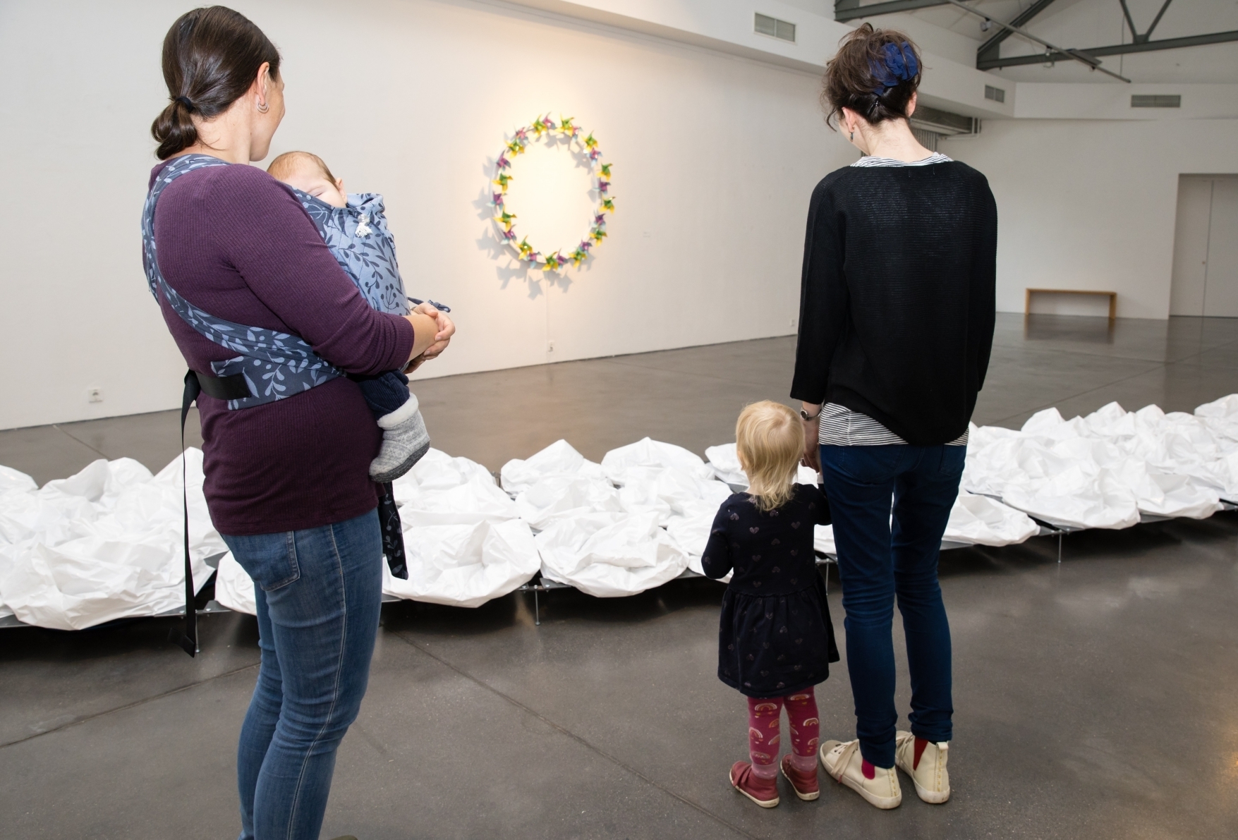Gleichmäßig und langsam, wie Wellen, heben und senken sich die weißen Plastiktüten, die auf dem Boden in der Q-Galerie in Schorndorf angebracht wurden. Meeresrauschen, Phasen einer Schwangerschaft oder ein Beatmungsgerät: Die Installation des Künstlers Nils Völker lässt vielfältige Interpretationen zu. Den drei Monate alten Ole, für den es der erste Besuch in der Q-Galerie ist, scheint sie zu beruhigen. Als die Führung durch die Ausstellung „rund“ für Mütter und Kleinkinder beginnt, schläft