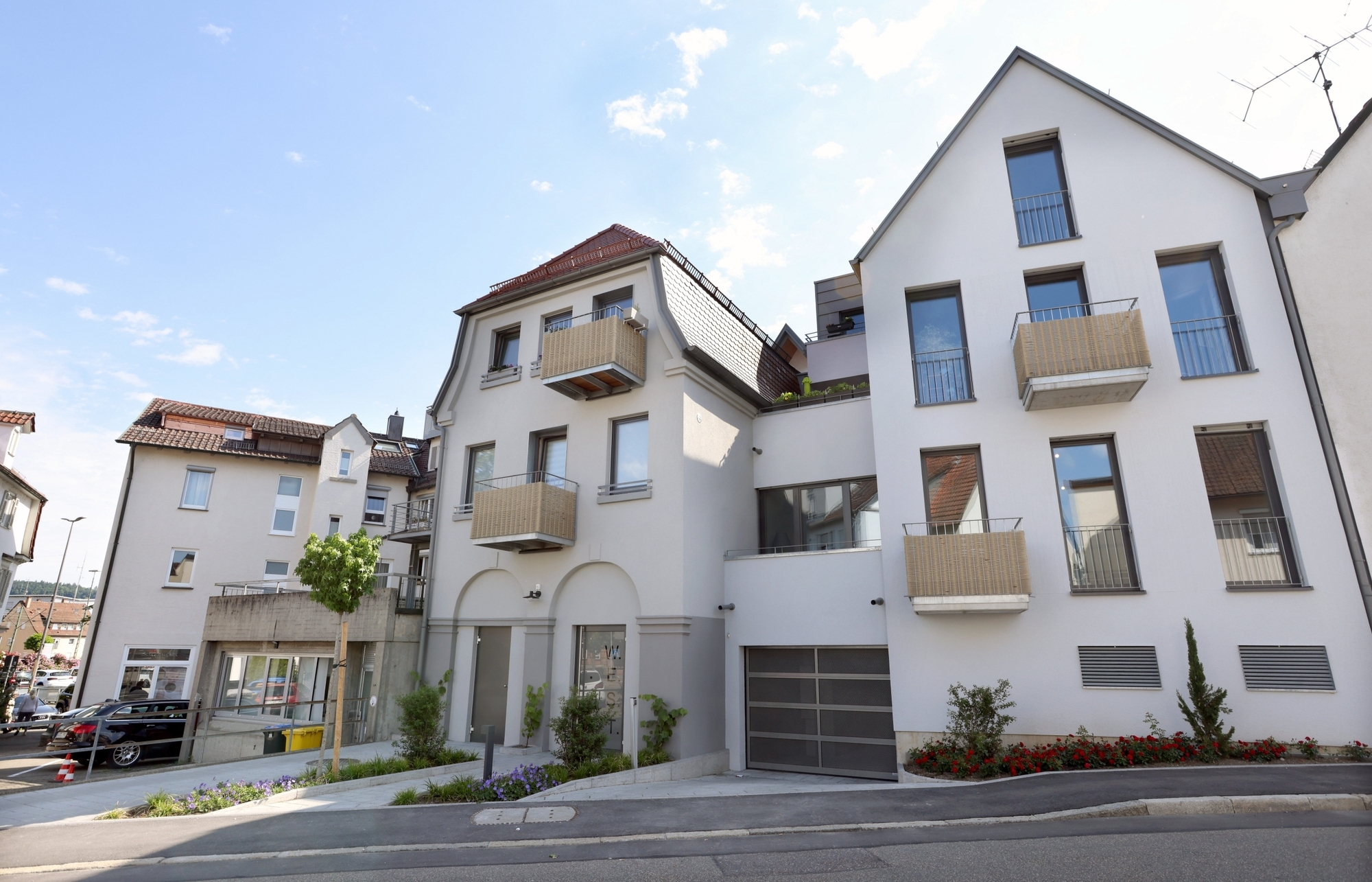 Ruhig plätschert im kleinen schattigen Innenhof das Wasser im Brunnen. Es ist ein besonderes Ambiente – und es ist ein besonderes Wohnprojekt, das sich zwischen der Gottlieb-Daimler-Straße 41 und der Urbanstraße verbirgt. Wo einmal fünf ineinander verschachtelte und teilweise bis zu 100 Jahre alte Gebäude standen, sind in den vergangenen zwei Jahren 14 höchst individuelle und energieeffiziente Wohnungen entstanden. Eins der alten Häuser wurde abgerissen, an seiner Stelle ein kleiner Innenhof