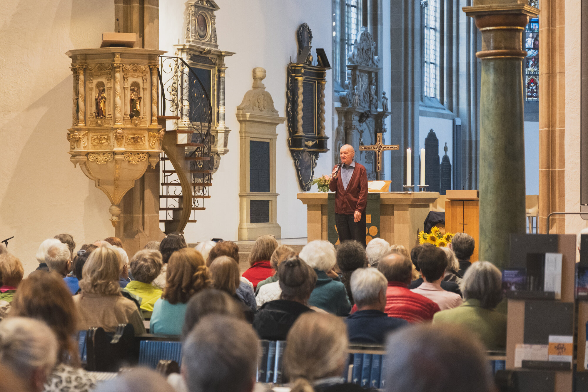 Schorndorf. In der Voraussicht, dass das Interesse groß sein würde, wurde der Vortrag des seit Jahrzehnten populären Theologen Eugen Drewermann vom Martin-Luther-Haus in die Stadtkirche Schorndorf verlegt. Und tatsächlich wollten gut 400 Besucher hören, was der friedensbewegte Mann zum Thema „Die Bergpredigt als Zeitenwende“ zu sagen hatte. Die Einladung erfolgte von der Ökumenischen Friedensgruppe innerhalb der Stadtkirchengemeinde. Und deren Sprecher Martin Jaeger
