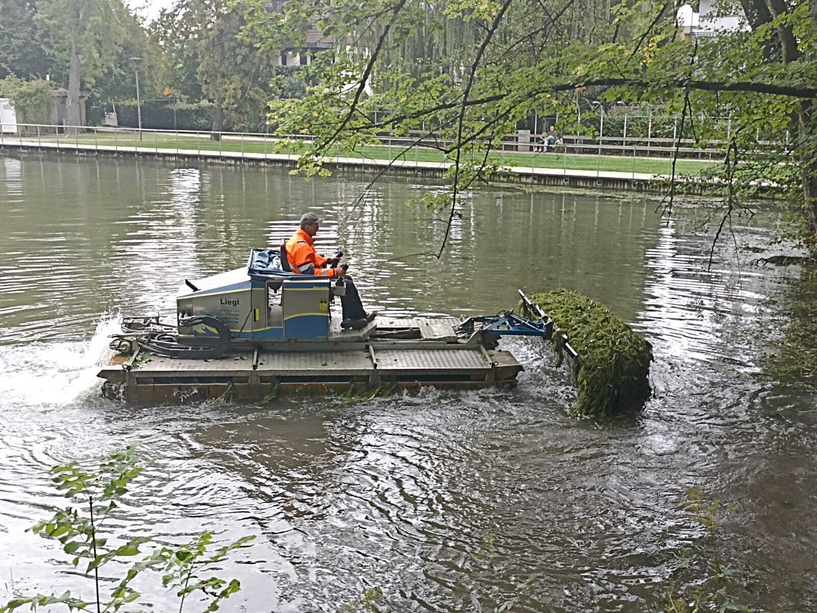 Was fährt denn da auf dem Schorndorfer Feuersee? So mancher Passant blieb am Dienstag (17.09.) und Mittwoch (18.09.) am Ufer stehen und betrachtete das Gefährt auf dem Gewässer, das gut sichtbar Grünzeug vor sich herschob. Warum solch eine Aktion erfolgen musste?