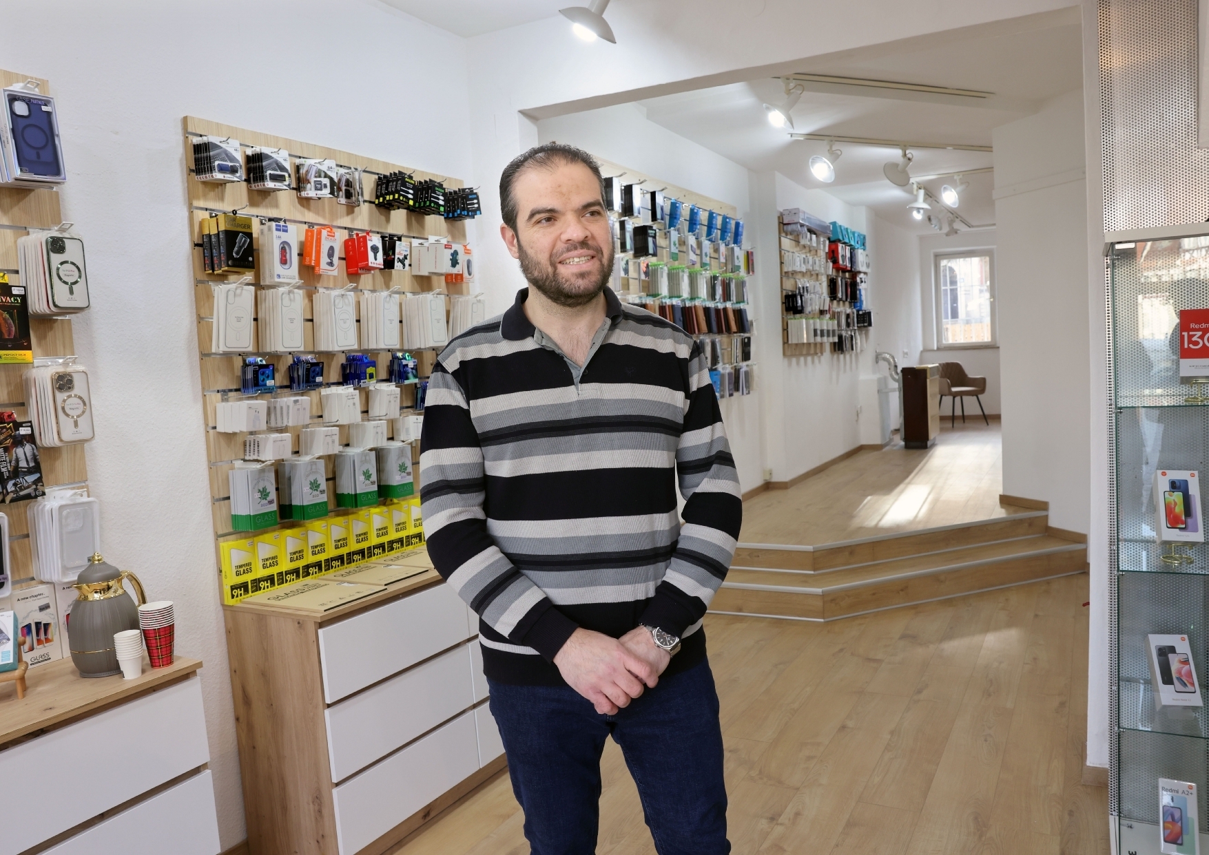 Handys mit Zubehör statt Regale voller Bücher: Im Hause Seelow am Oberen Marktplatz 5 in Schorndorf hat sich in den vergangenen Wochen einiges getan. Nachdem Kirsten Klöble ihre Buchhandlung nach nur fünf Jahren aufgegeben hat, ist es Hauseigentümerin Sabine Seelow gelungen, mit Khaled Alnajjar einen Nachmieter zu finden: Der 40-Jährige ist 2016 aus Damaskus in Syrien nach Deutschland geflohen und lebt mit seiner Frau und seinen sechs, zwölf und 15 Jahre alten Kindern in Weiler. Fünf Jahre