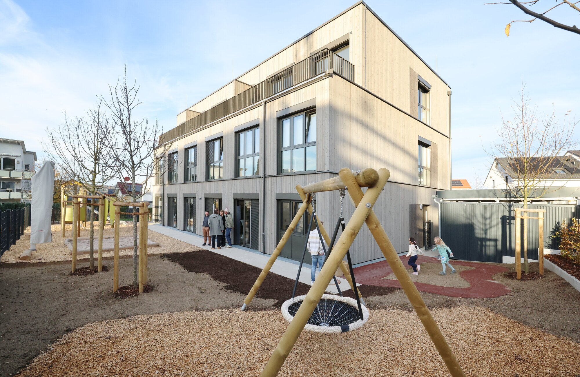 Schorndorf. Die Bauzeit dieser Kita war beeindruckend. In gerade mal acht Monaten entstand am Bettina-von-Arnim-Weg die zweigruppige Kita Obere Straßenäcker samt drei Wohnungen im Obergeschoss. 2024 hatte der Gemeinderat den Bau beschlossen, im März dieses Jahres startete die Frankfurter Lechner Cube Holzmodulbau GmbH mit dem Bau. Jetzt wurde der Kindergarten mit den beiden Ü-Drei-Gruppen feierlich eingeweiht.