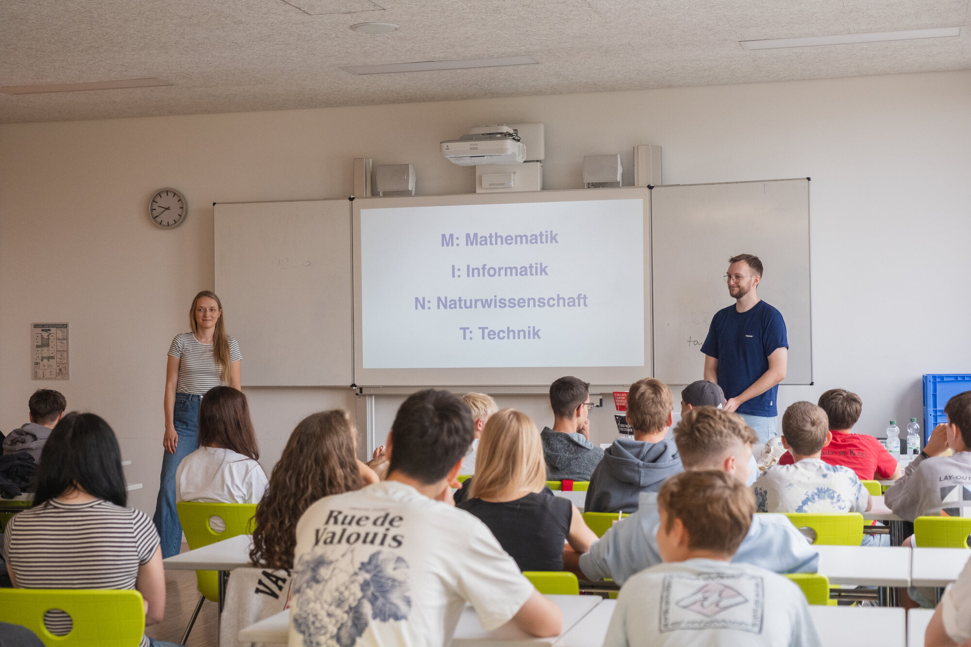 Schorndorf. „Ist es nicht so, dass wir irgendwann mit Künstlicher Intelligenz (KI) dümmer werden?“ Das wollte ein Schüler des Burg-Gymnasiums Schorndorf von Cornelia Mattern und Julian Rössler wissen, Coaches bei „COACHING4FUTURE“. Das Programm zielt darauf ab, Schüler/-innen Ausbildungswege in den Bereichen Mathe, Informatik, Naturwissenschaften und Technik (MINT) aufzuzeigen. Theoretische und praktische Einblicke haben die Coaches mit einem interaktiven Vortrag und
