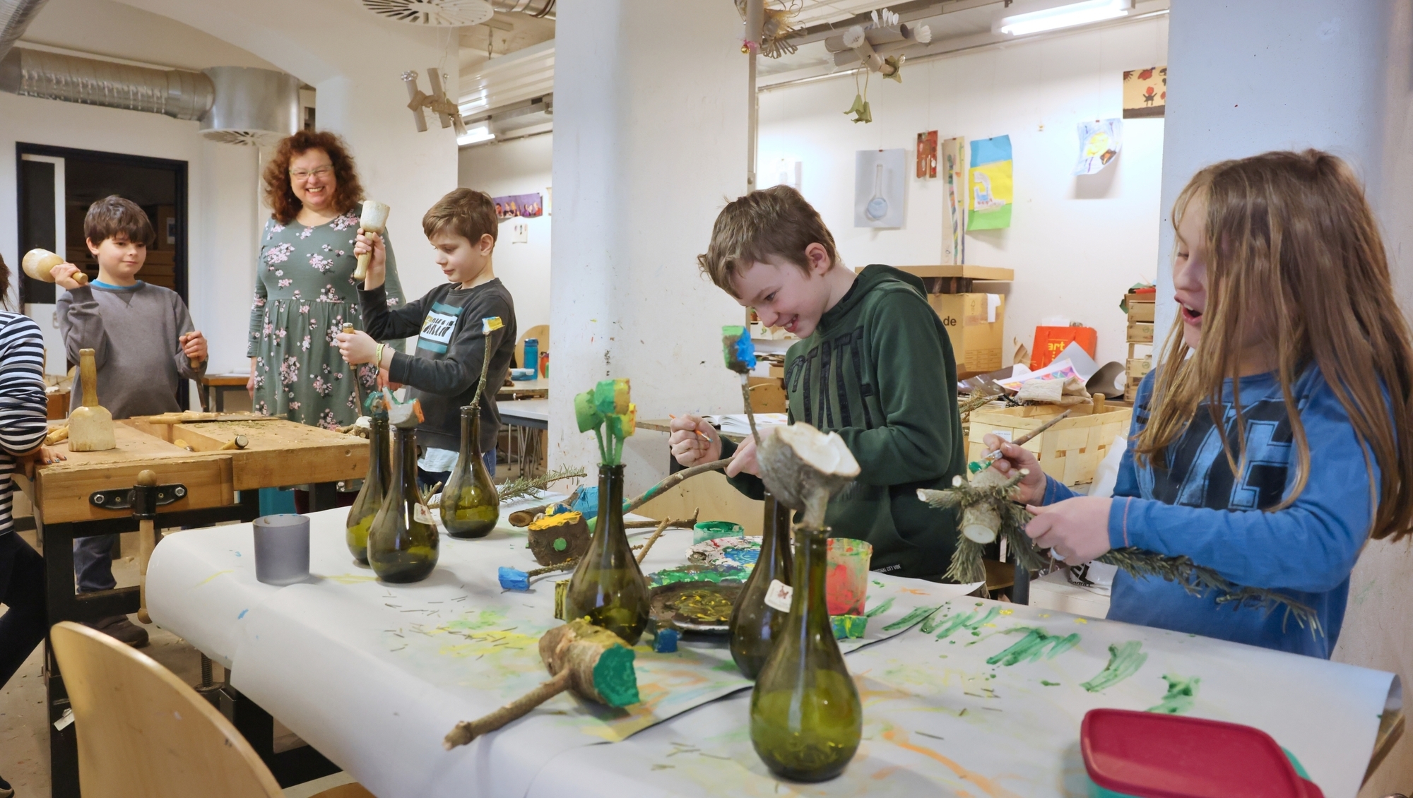 Aus Alt wird Neu: Im Holzbildhauerei-Workshop mit der Künstlerin Ebba Kaynak in Schorndorf bearbeiten Kinder die Äste alter Weihnachtsbäume und machen daraus Blumen. Ziel des dreitätigen Workshops ist, einen ganzen Blumenstrauß aus Tannenholz herzustellen – passend zum Frühling eben.