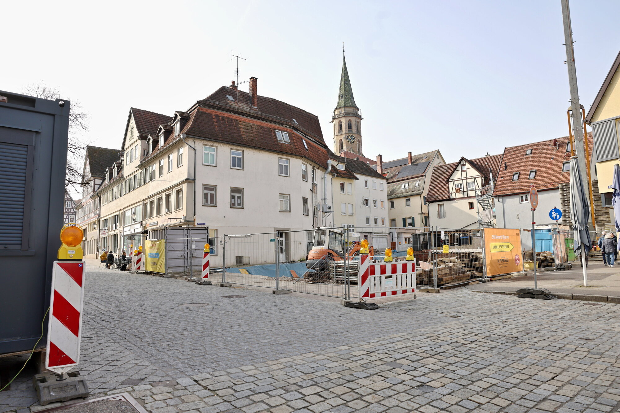 Schorndorf. Ende September haben die Abbrucharbeiten an der Ecke Marktplatz/ Neue Straße begonnen - wo früher mal das Gebäude der Deutschen Bank stand, klafft nun ein Riesenloch. Klar war, dass die Baustelle für die Anlieger eine Belastung werden würde, doch zuletzt liefen die Einzelhändler aus der Neuen Straße Sturm, weil ihre Geschäfte vom Marktplatz fast gänzlich abgeschnitten waren. Jetzt hat Bauherr Albrecht Borck darauf reagiert.