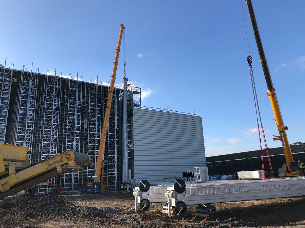 „Unheimlich stolz“ war Geschäftsführer Philipp Hahn-Woernle von der Firma viastore, „dass wir das mit Ihnen machen dürfen“. „Das“ ist das „topmoderne“ (Hahn-Woernle) Hochregallager, das derzeit entsteht. Auch Hahn-Woernle sprach von „Augenhöhe“, auf der man sich begegne. Er regte – augenzwinkernd – an, „zum nächsten Projektschritt zu schreiten, damit wir im Zeitplan bleiben“. Was folgte, war die spektakuläre Kranaktion.