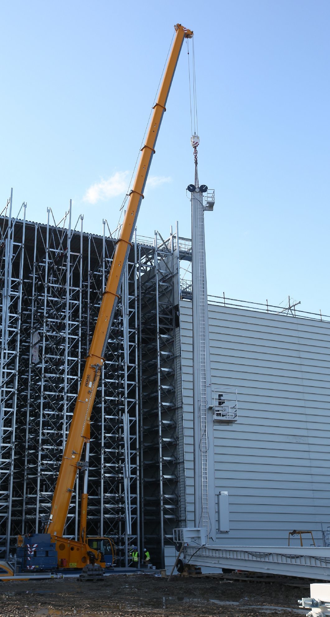 Schorndorf. 28 Meter ist das neue Hochregallager der Firma Löffelhardt hoch. Gleich lang ist das 10,9 Tonnen schwere Regalbediengerät, das der Kran vorsichtig in dieses Hochregallager hievt. Eine spektakuläre Aktion am Mittwochnachmittag auf dem großen Areal in der Gottlob-Bauknecht-Straße, wo nach den Worten von Rainer Rommel „immer mehr Löffelhardt in das ehemalige Bauknecht-Gelände reinkommt“.
