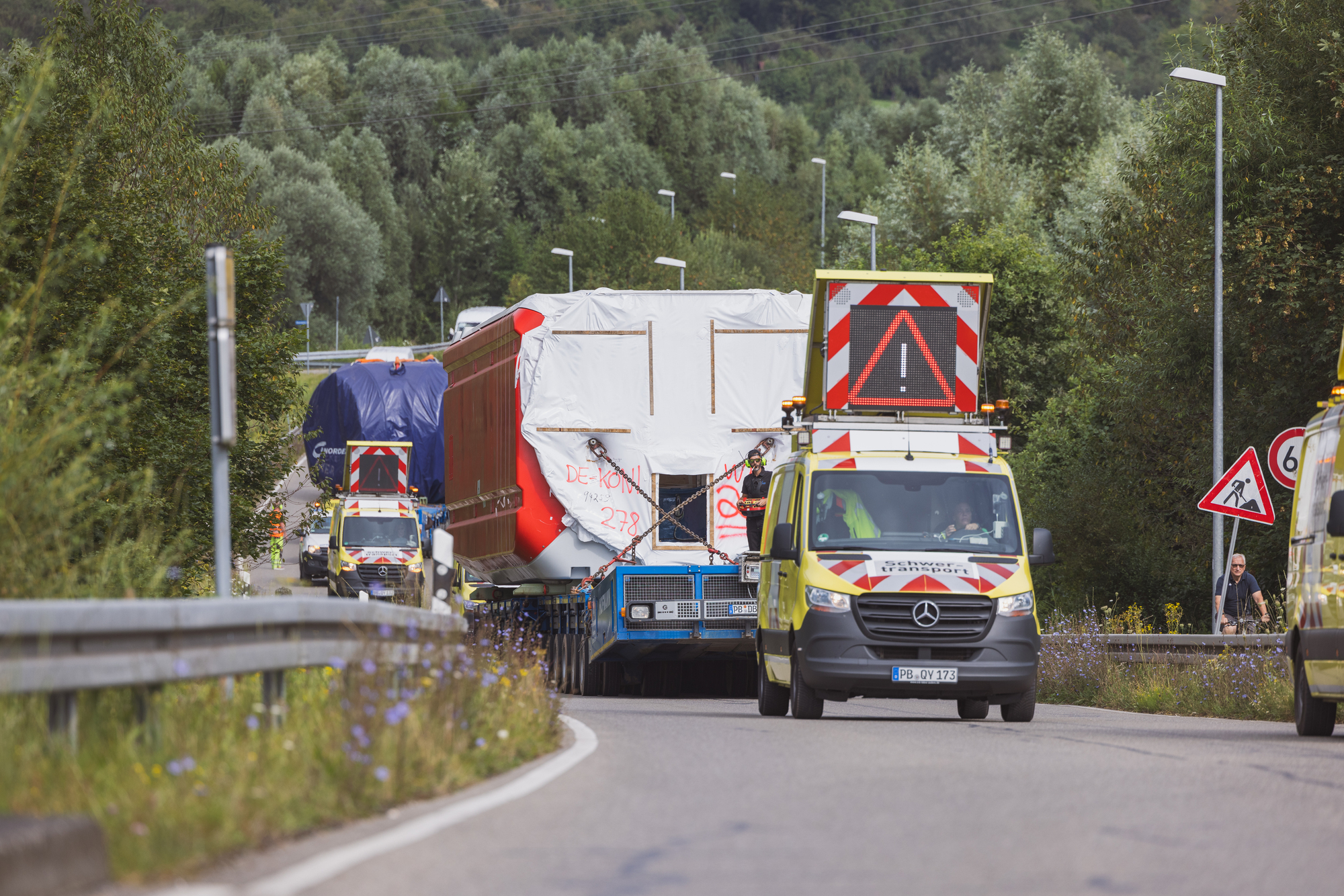 Mit Spannung haben ihn viele erwartet, den Transport der Teile zweier Windräder quer durch Schorndorf zum Windpark Königseiche bei Ebersbach. An diesem Mittwoch hat er mit einem Tag Verzögerung nun begonnen: Begleitet von acht Service-Fahrzeugen, die auf der Strecke für freie Fahrt sorgten, starteten zwei überbreite, ferngesteuerte Modulartransporter auf der Wiese am Unteren Ziegelfeld in Richtung Weilermer Kreisel. Schon auf diesem Stück zeigte sich: Feinarbeit war von den beiden Männern an