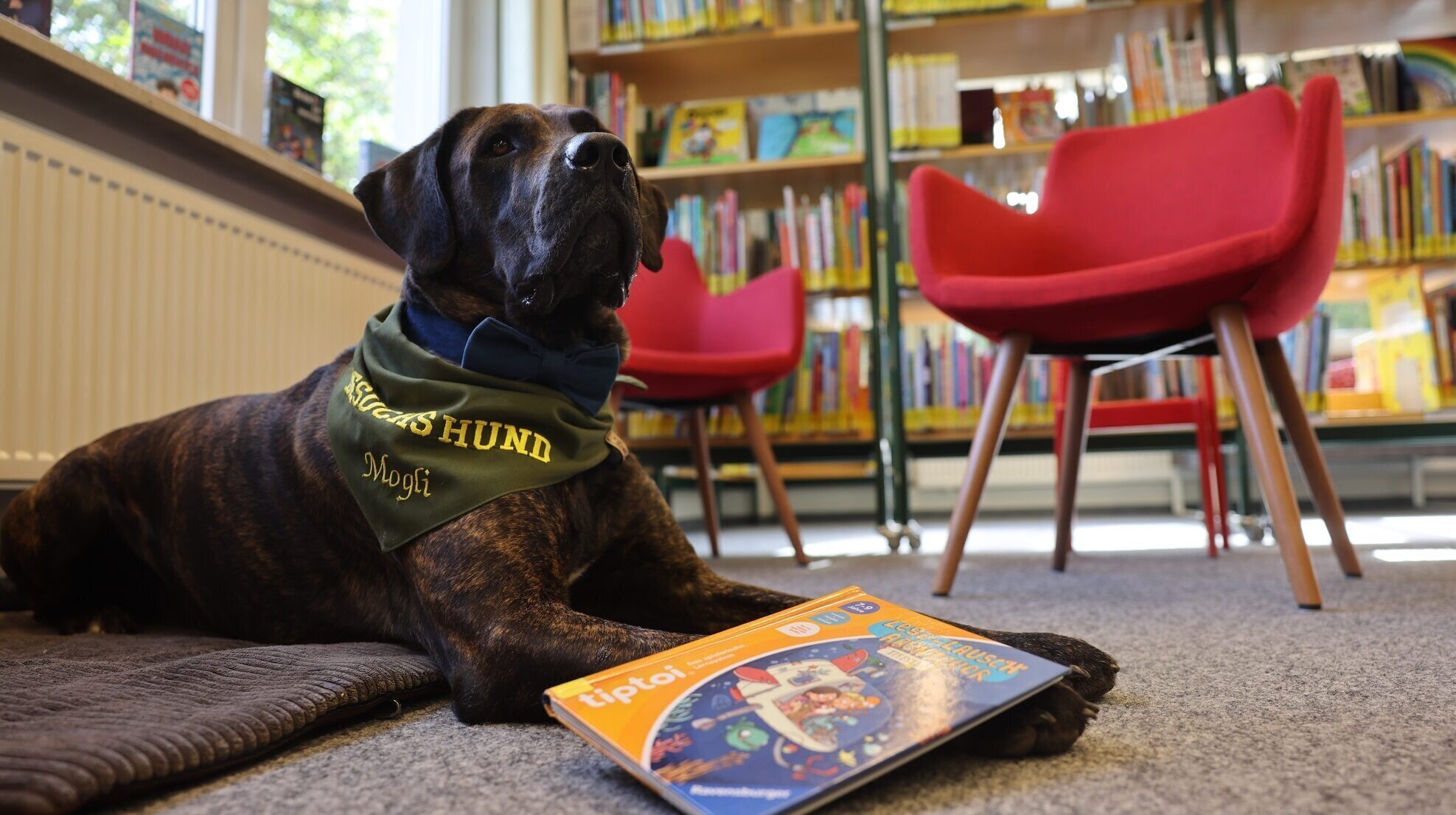 Mogli hat schon im Auto auf dem Parkplatz die Lauscher aufgespannt, sein Frauchchen Michelle Götze hört ein leises Fiepsen. Ein Zeichen für die 31-jährige Hundehalterin, dass sich ihr Mischlingshund aus Dogge und Großem Sennenhund auf das Bevorstehende freut: die Lesestunde in der Stadtbücherei Schorndorf (wir berichteten).