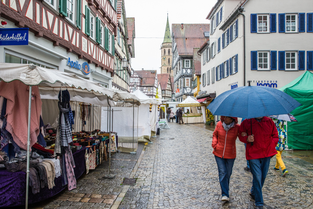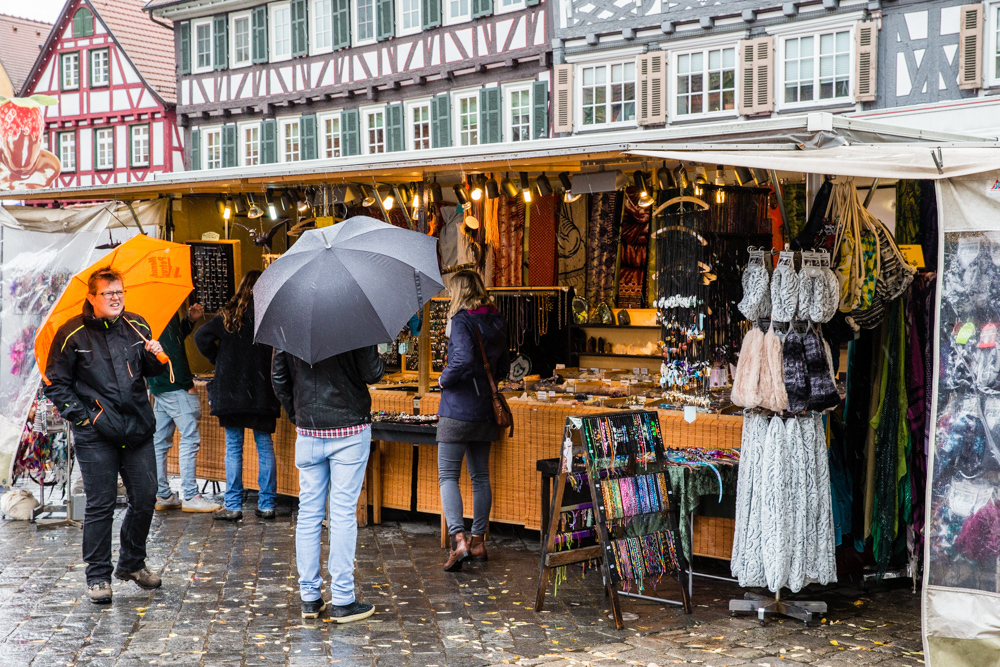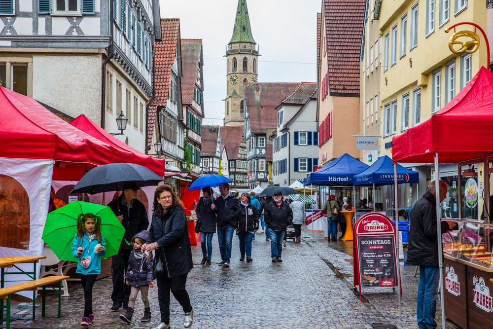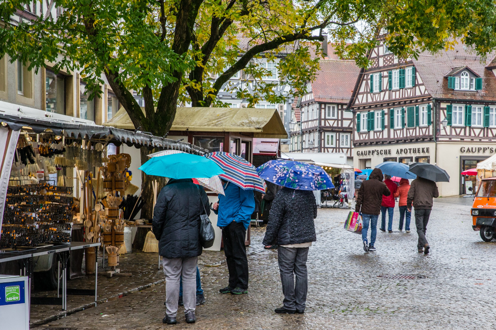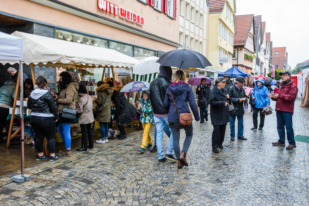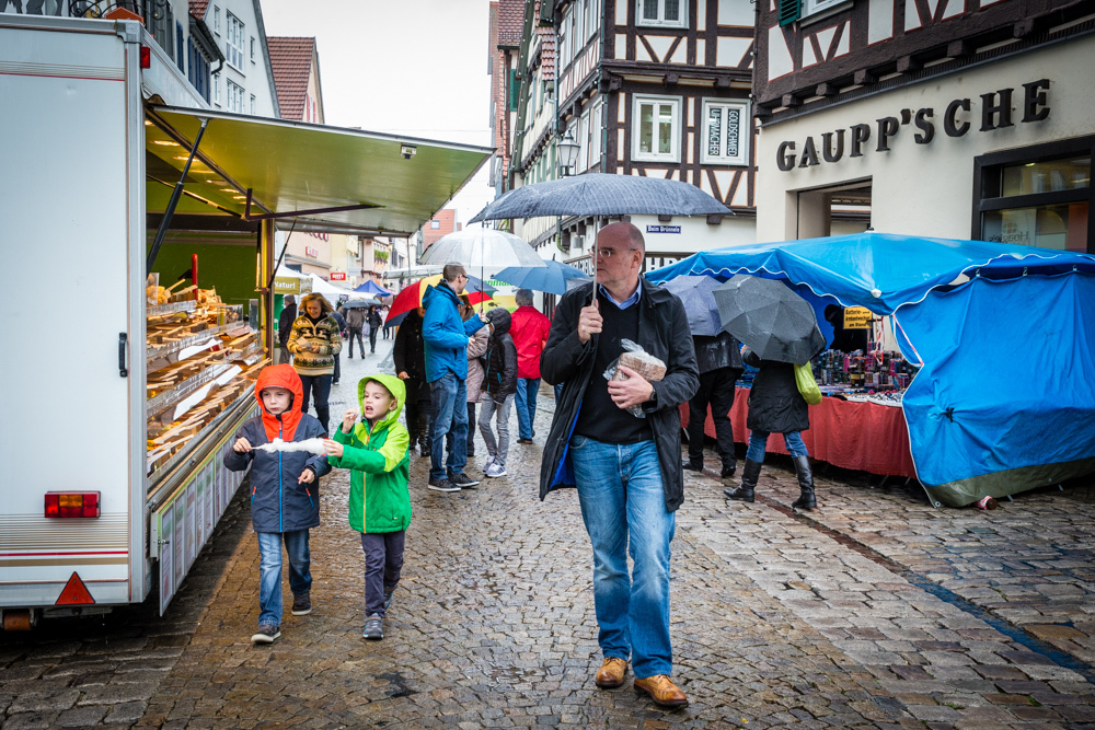 Und sie wurden belohnt: Mag der Stadtmarkt dieses Mal auch erst spät in Schwung gekommen sein – mit ein paar Tausend Besucher weniger als in den Vorjahren – die Veranstalter sind zufrieden: „Wir sind“, sagt Fink, „mit einem dicken blauen Auge davongekommen“. Ein guter Tag für Schorndorf also – und daran hat das bewährte Konzept sicher seinen Anteil: Mit einem eingespielten Team organisiert Schorndorf-Centro den Stadtmarkt schon seit vielen Jahren. Bei der Standauswahl wird auf Vielfalt geachtet – und auf Vorauskasse: „Sonst hätte man bei so einem Wetter wie heute zwei Stände“, ist sich Fink sicher.