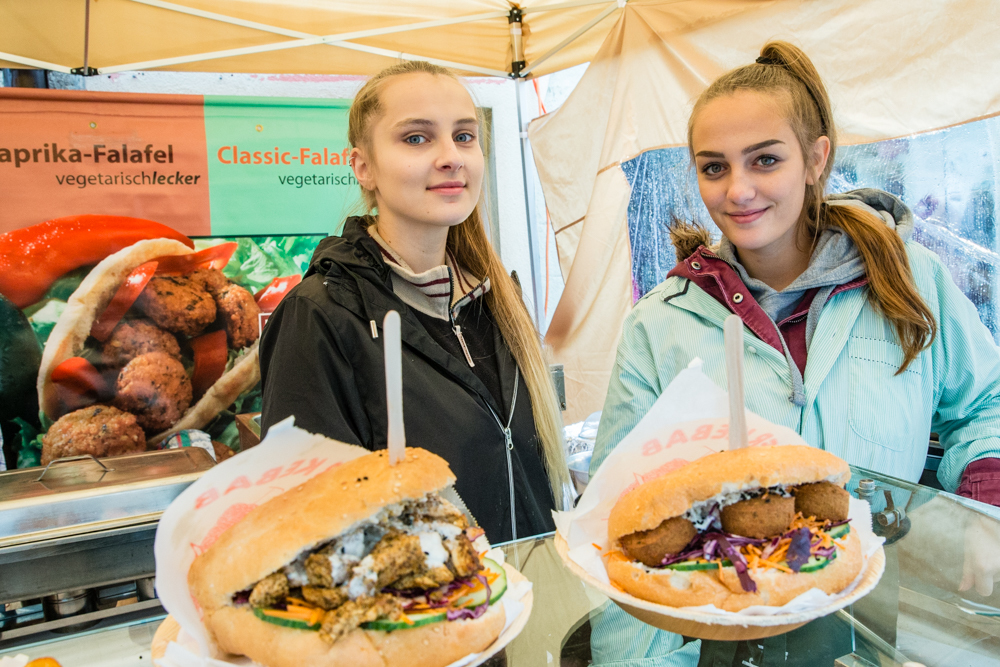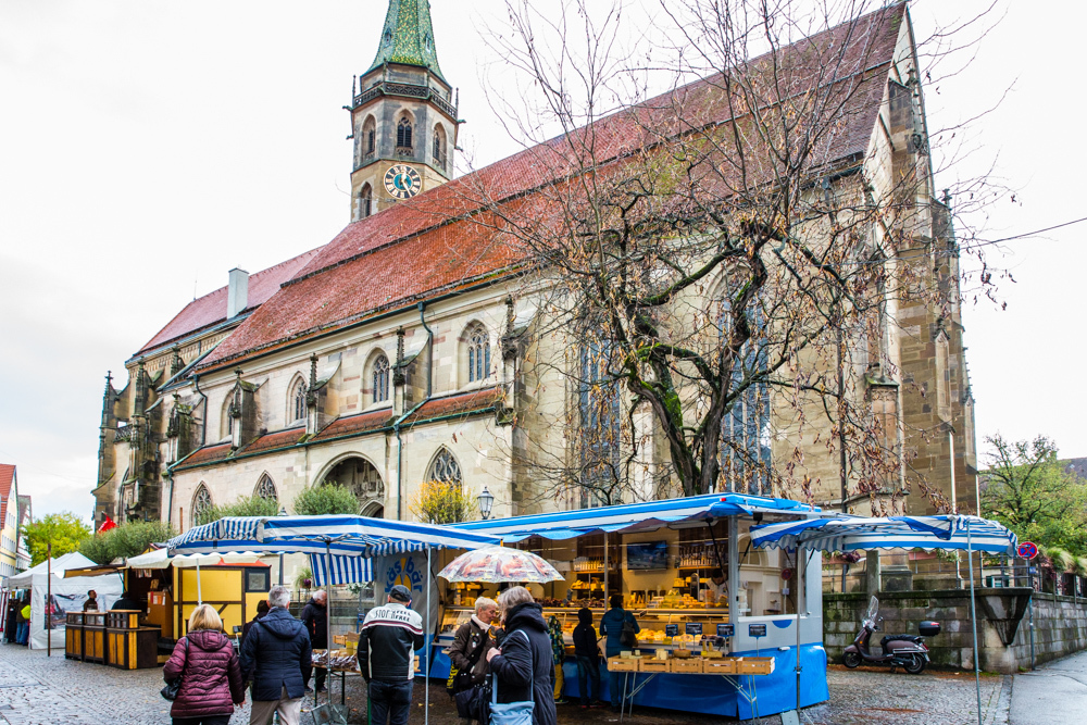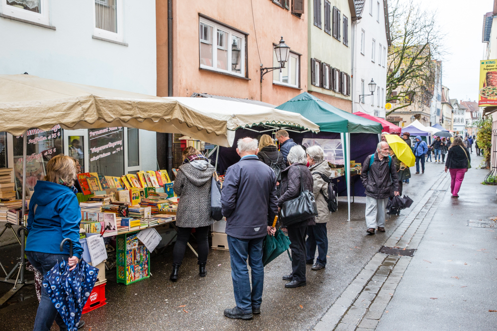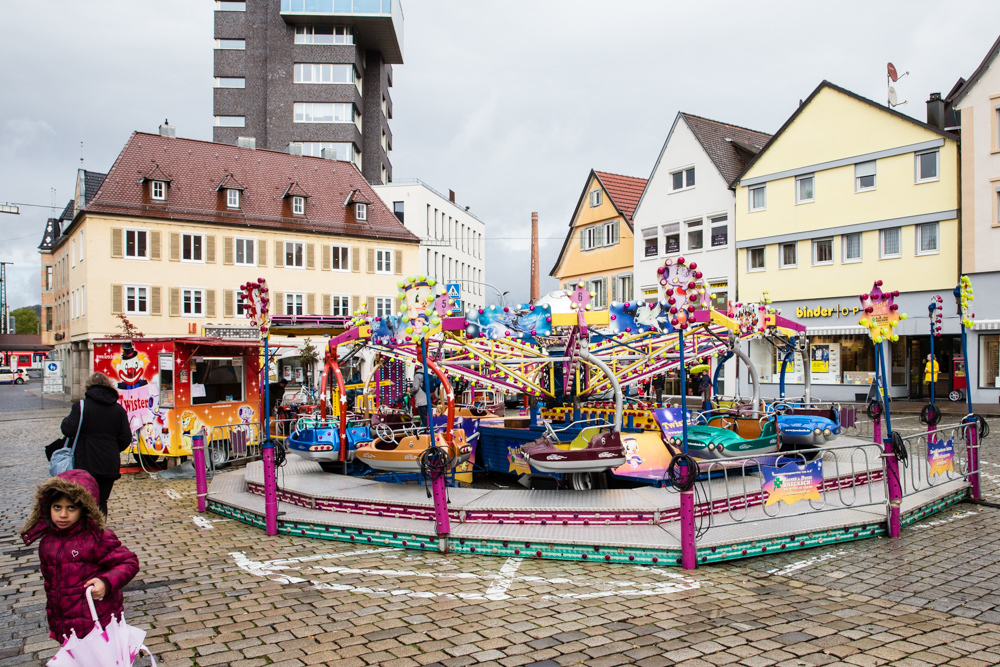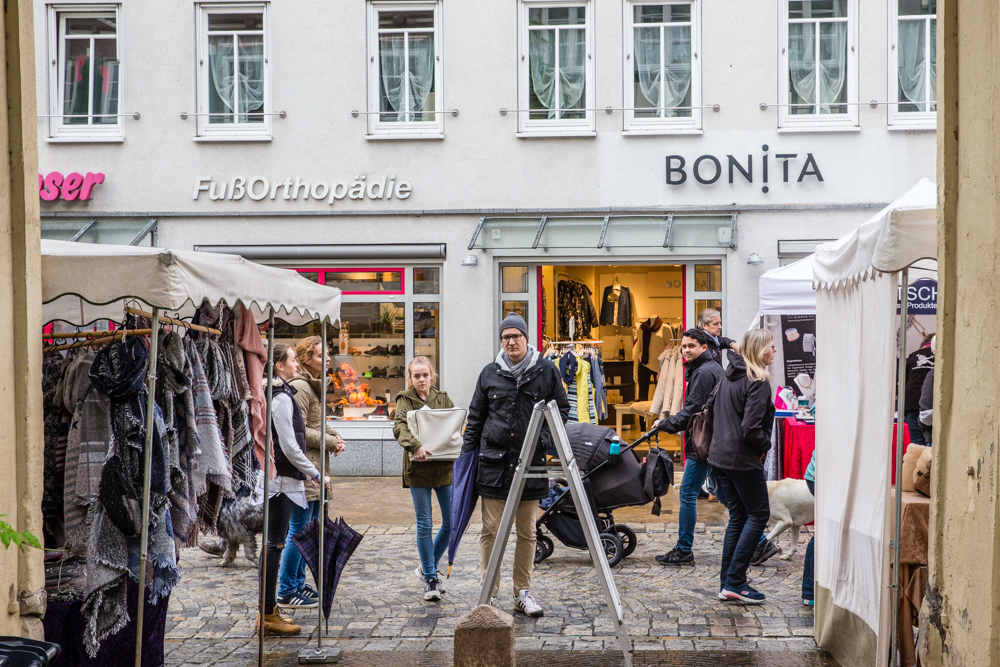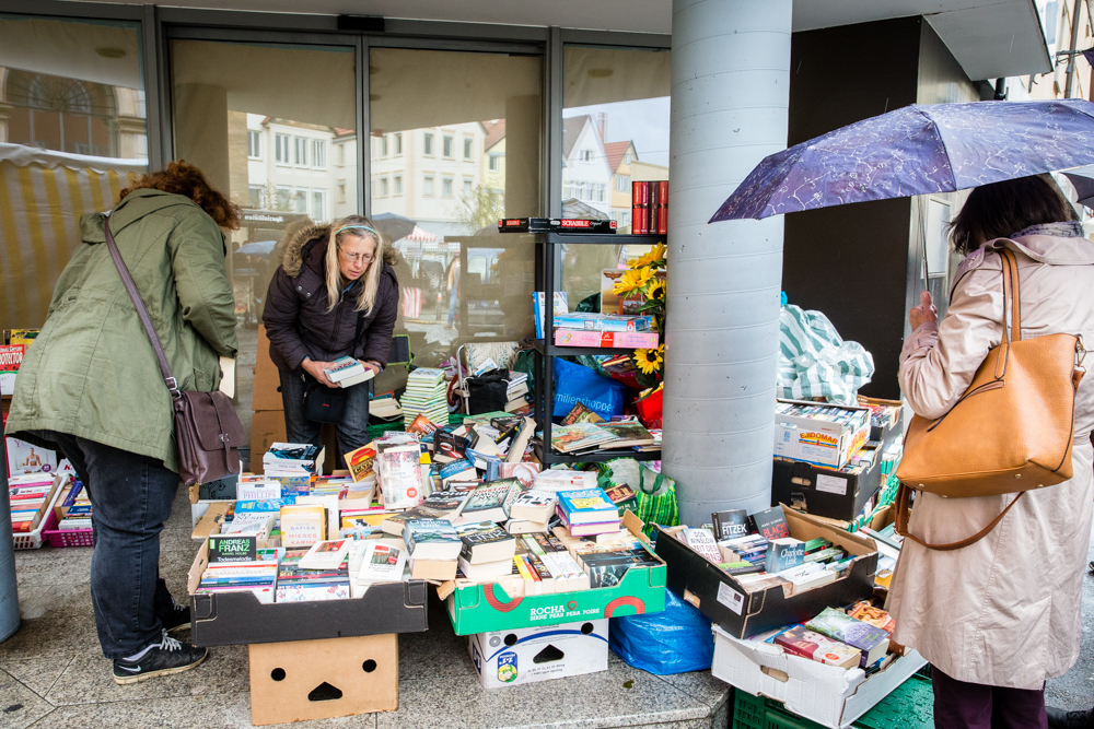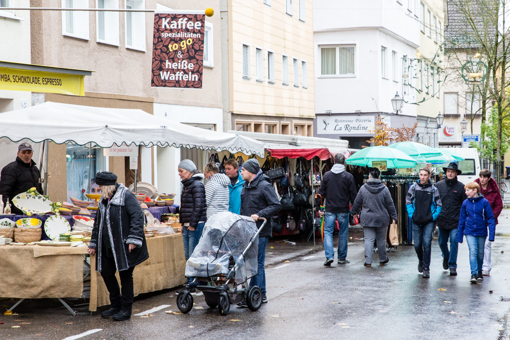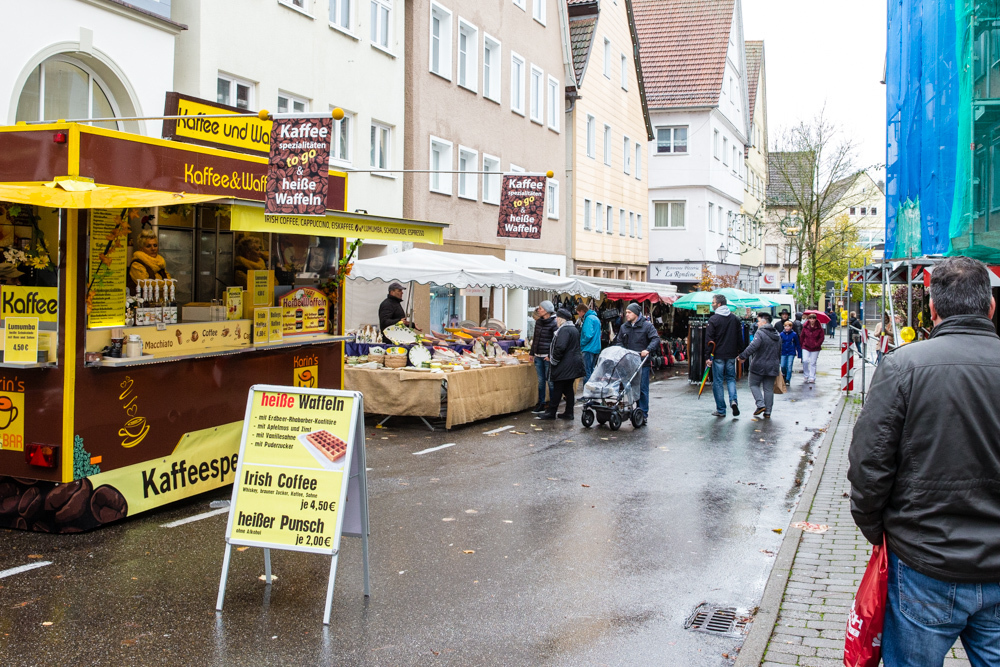 Dass sich der Tag noch so gut entwickeln würde, wer hätte das am Morgen gedacht. Regenschauer, Wind und Schmuddel: Stadtmarktwetter ist das nicht. Doch kaum war die Mittagszeit vorüber, kam die Sonne – und mit ihr strömten die Massen, die sich den ganzen Nachmittag durch die Johann-Philipp-Palm- und die Gottlieb-Daimler-Straße drückten, den verkaufsoffenen Sonntag in den Geschäften nutzten und beim Mädchenflohmarkt im Café de Ville vorbeischauten. Und die sich’s auf dem Marktplatz an allerlei Essens-Ständen schmecken ließen, die Bratwürste, Langosch und Dinnede aus dem Holzofen genossen, Salami und Käse aus Frankreich probierten, dazu Schorndofer Bier und Coffee to go. Flaneure, die in der Neuen Straße in Bücher- und Schallplattenkisten kramten und sich auf dem Archivplatz und dem Schlosswallschulhof über die neuesten Modelle der Autohändler informierten.