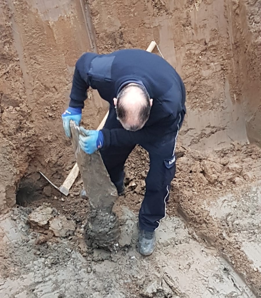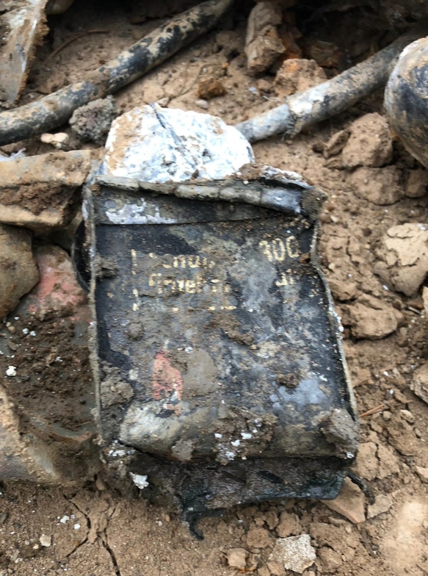 Als jetzt auf besagtem Grundstück gegraben und mit Hilfe eines Baggers unter Aufsicht des Kampfmittelbeseitigungsdienstes Schicht um Schicht des benzin- und ölgetränkten Erdreichs abgegraben und begutachtet wurden, kamen neben verschiedenen Metallteilen unter anderem auch der Steuerknüppel des Jagdbombers, diverse Munitionsteile – die Maschine war mit kleinen Bordkanonen und mit Maschinengewehren bestückt – und schließlich in etwa fünf Metern Tiefe der komplette Motorblock zum Vorschein. Letzteren, einen Zwölfzylinder-V-Motor, hat der Geschäftsführer des mit der Grabung beauftragten Unternehmens, Hartmut Bühler, mit nach Hause genommen und sorgfältig gereinigt, um möglicherweise über die Motornummer Genaueres über das Flugzeug und eventuell sogar über den Piloten zu erfahren.