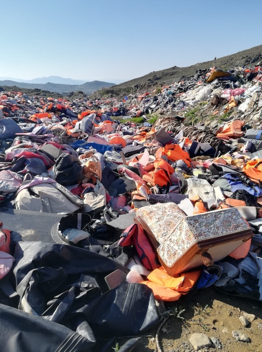 Der Friedhof der Rettungswesten: Hunderte orangefarbiger Flecken sprenkeln die Müllkippe. Regelmäßig werden sie verbrannt, „und es kommen neue oben drauf“, große von Erwachsenen, kleine von Kindern – die Überzieher bezeugen, dass Menschen den Meerweg per Schlauchboot überlebt haben. Aber nicht wegen der Westen: „80 Prozent sind Fälschungen“ und würden in Seenot niemanden über Wasser halten.