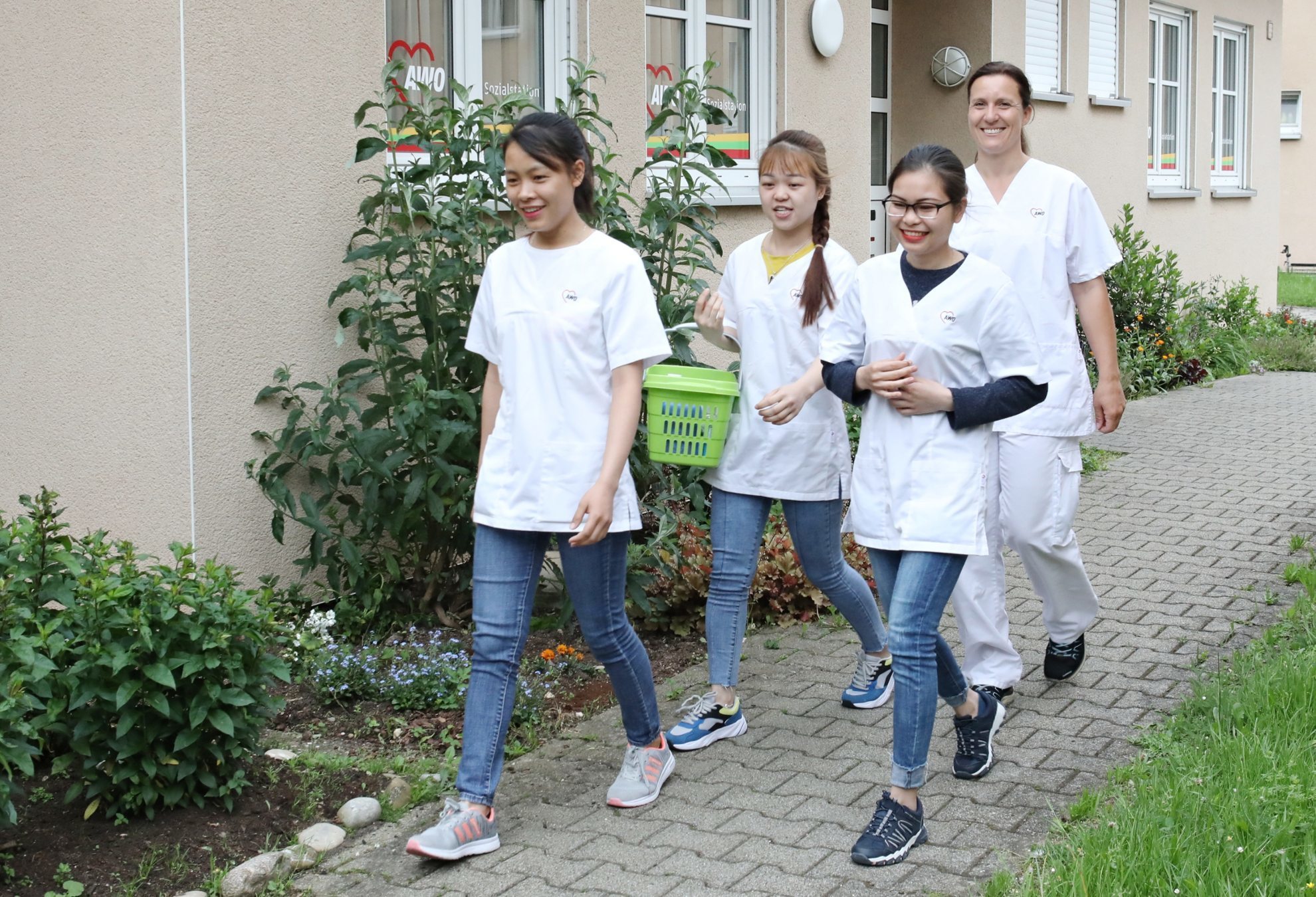 Die drei Vietnamesinnen kamen im Oktober vergangenen Jahres nach Deutschland, um bei der Awo eine Ausbildung zur Altenpflegerin zu machen. Vorher gingen sie auf ein Medizin-College in Thai Binh, 110 Kilometer südöstlich von Hanoi, wo sie bereits das ein oder andere über die Pflege von Menschen und die deutsche Sprache gelernt haben. Die Frauen Anfang 20 leben in kleinen Wohnungen der Awo, für die sie nur wenig Miete bezahlen. In Vietnam ist es für junge Menschen schwierig, eine gute Arbeit zu finden.