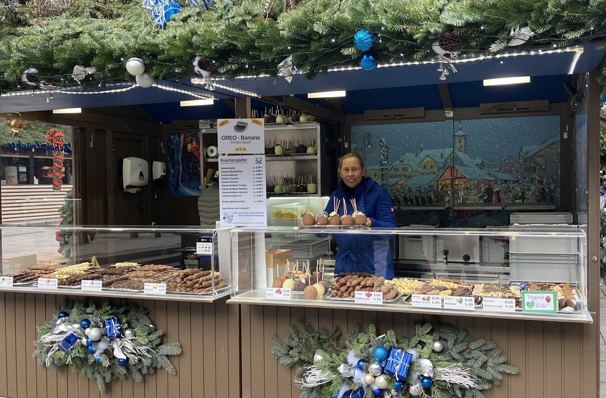 Stuttgart/Schorndorf. Ihr tränenreicher Abschied von ihrem „Riesenhamburger“ und dem Cannstatter Wasen liegt gerade etwas mehr als einen Monat zurück (wir berichteten) – und schon steht die Schorndorfer Schaustellerin Simone Benda-Mussenbrock wieder geschäftig in einer Holzhütte. Zwar hat sie dem bunten Treiben auf dem Volks- und Frühlingsfest emotional Lebewohl gesagt, ihren Schoko-Früchte-Stand auf dem Stuttgarter Weihnachtsmarkt führt sie jedoch weiter.