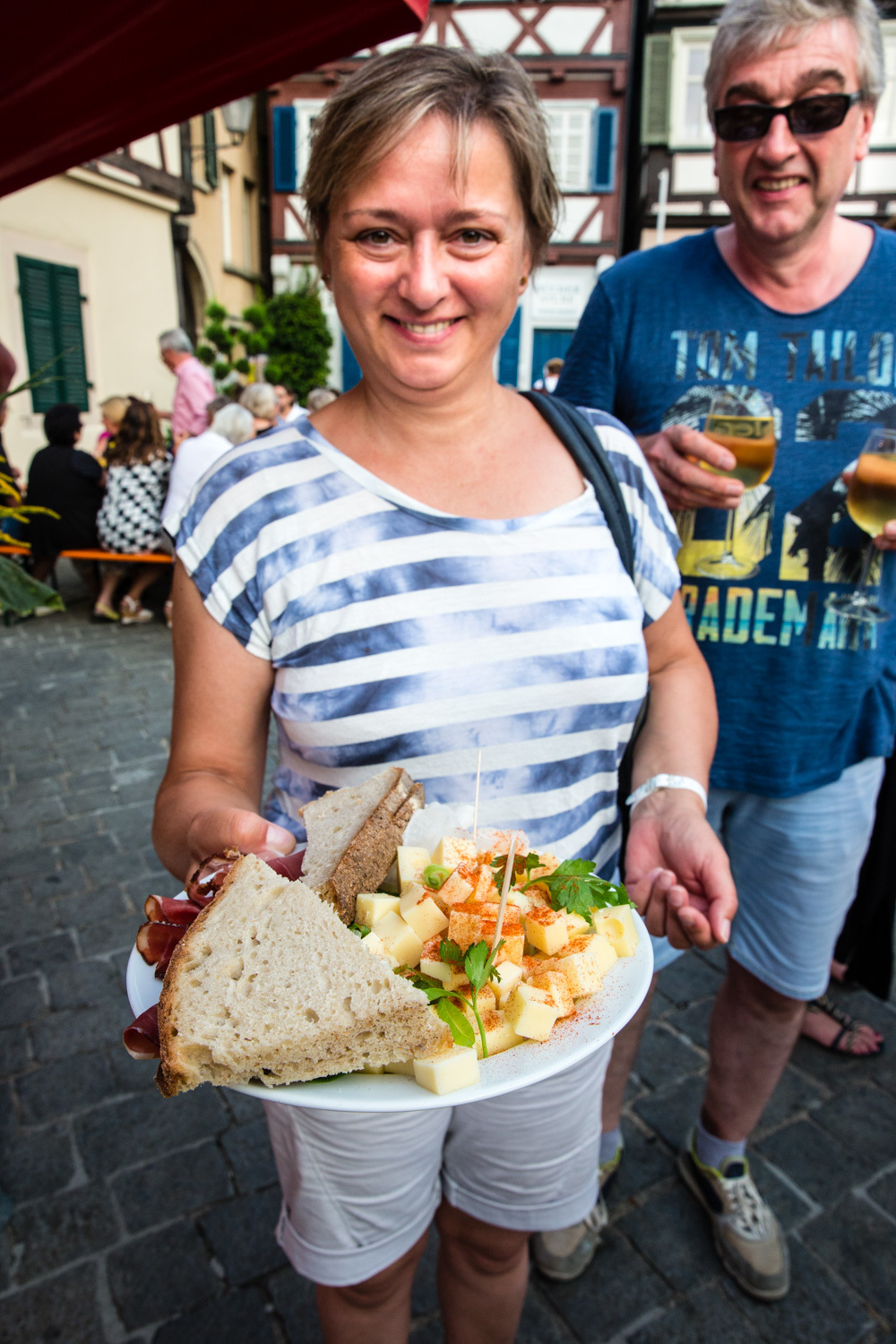Außer den beiden Ellwangers aus Winterbach und Großheppach waren drei weitere Weinproduzenten am Wochenende auf dem Schorndorfer Marktplatz vertreten: aus Geradstetten die Weinkellerei und Fruchtsaftkelterei Knauer sowie aus Beutelsbach das Weingut Markus Dobler und die Remstalkellerei. Sie alle haben Anbauflächen rund um Schorndorf, das ist die Voraussetzung, um bei den Weintagen dabei sein zu können. In Schorndorf gebe es für ein Weinfest eine sehr schöne Atmosphäre mit den Fachwerkhäusern am Marktplatz, meint Angelika Knauer vom gleichnamigen Weingut aus Geradstetten. Auch die großen, weißen Schirme mit den bunten Lampen darunter würden ihren Beitrag leisten, dass die Leute schön sitzen können.