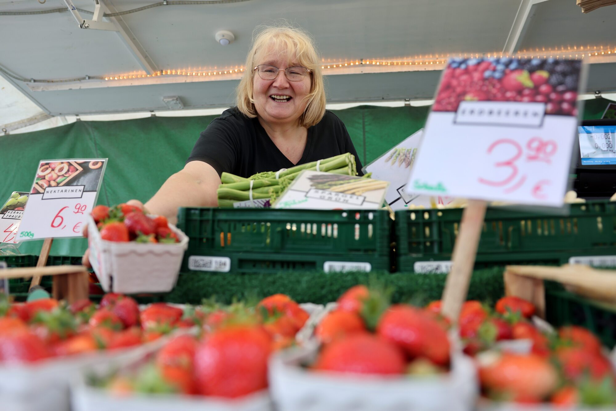 „Sind die auch schön saftig?“, will eine Kundin auf dem Wochenmarkt in Schorndorf am Obst- und Gemüsestand von Matthias Schaaf wissen. Sie meint natürlich die Erdbeeren, die es nun endlich wieder aus heimischem Anbau zu kaufen gibt. Noch wachsen die Pflanzen unter Folie und bis zum Muttertag wird der Preis nicht fallen.