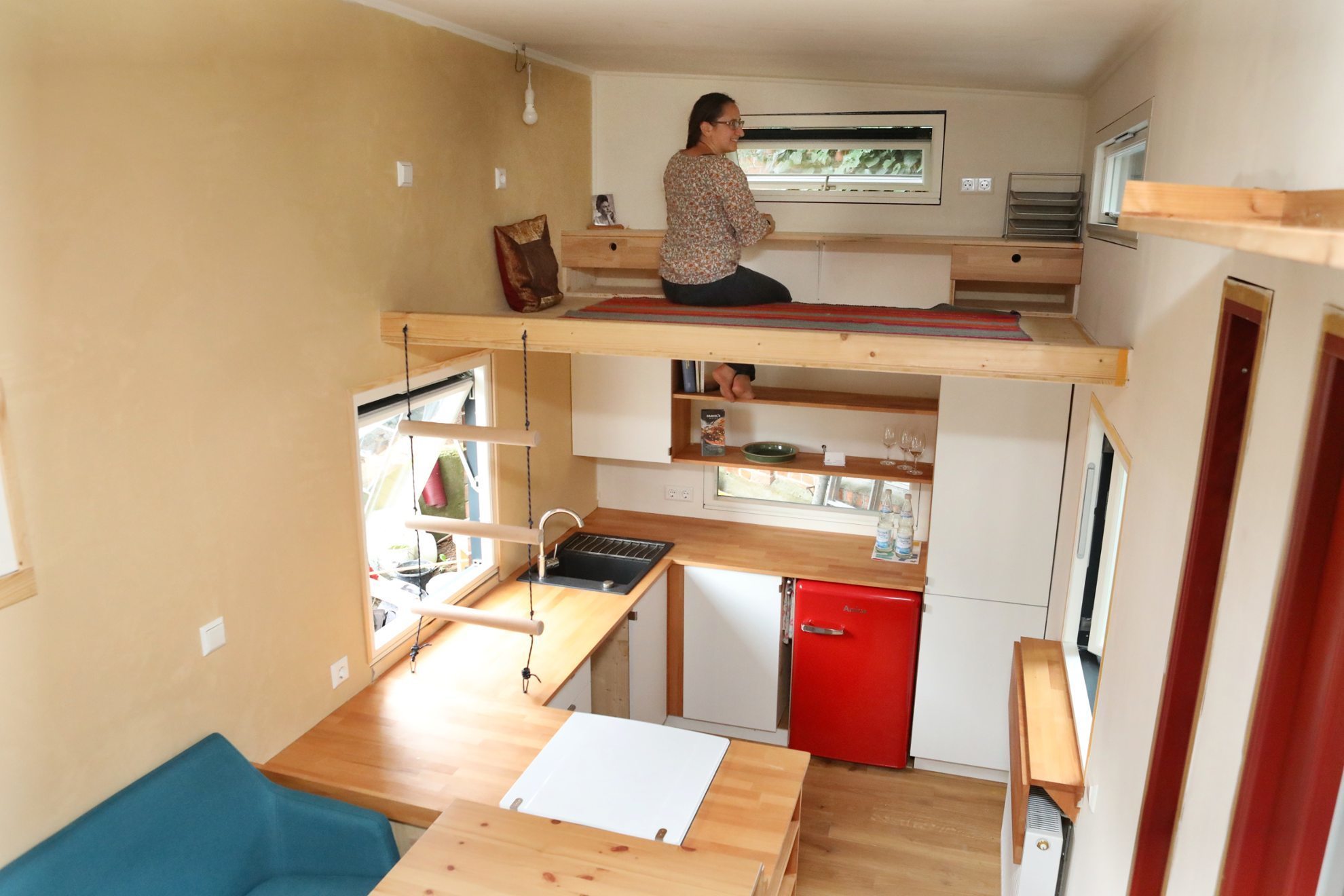 Auf 18 Quadratmetern gibt es hier alles Erdenkliche: ein Bett, Dusche, Toilette, Küche, einen großen Essbereich, eine Leinwand zum Fernsehen und einen Schreibtisch. Madeleine Krenzlin hat ein kleines Raumwunder vollbracht. In dem kleinen Häuschen, das auf Rädern steht, hat sie zwei Ebenen aus Holz eingezogen. Unten sind Bad und Küche, darüber befindet sich auf der einen Seite das Bett, auf der anderen ein Bereich, wo Krenzlin ihren Arbeitsplatz hat. Mit den Ebenen kommt sie auf eine Wohnfläche von 25 Quadratmetern.