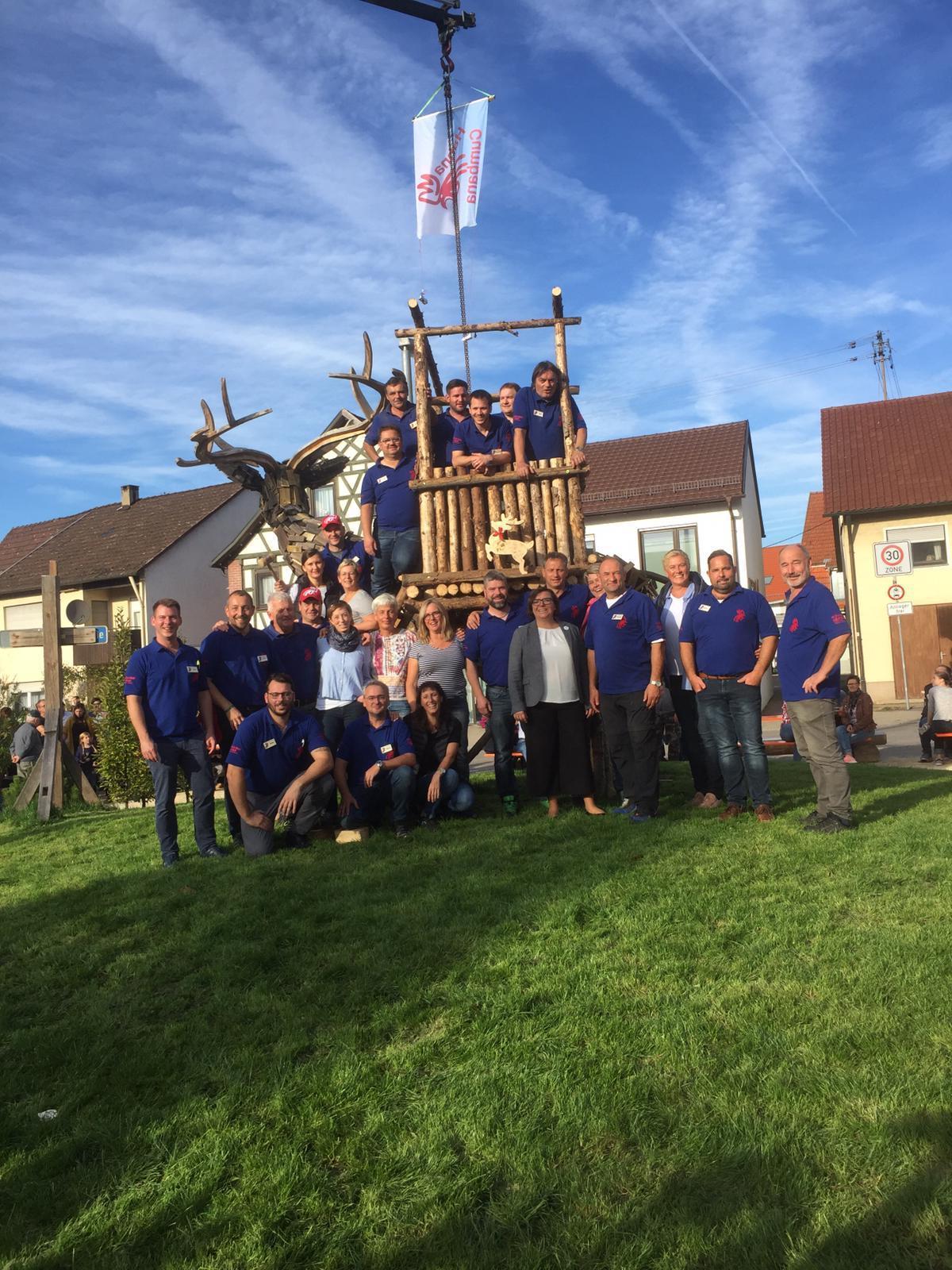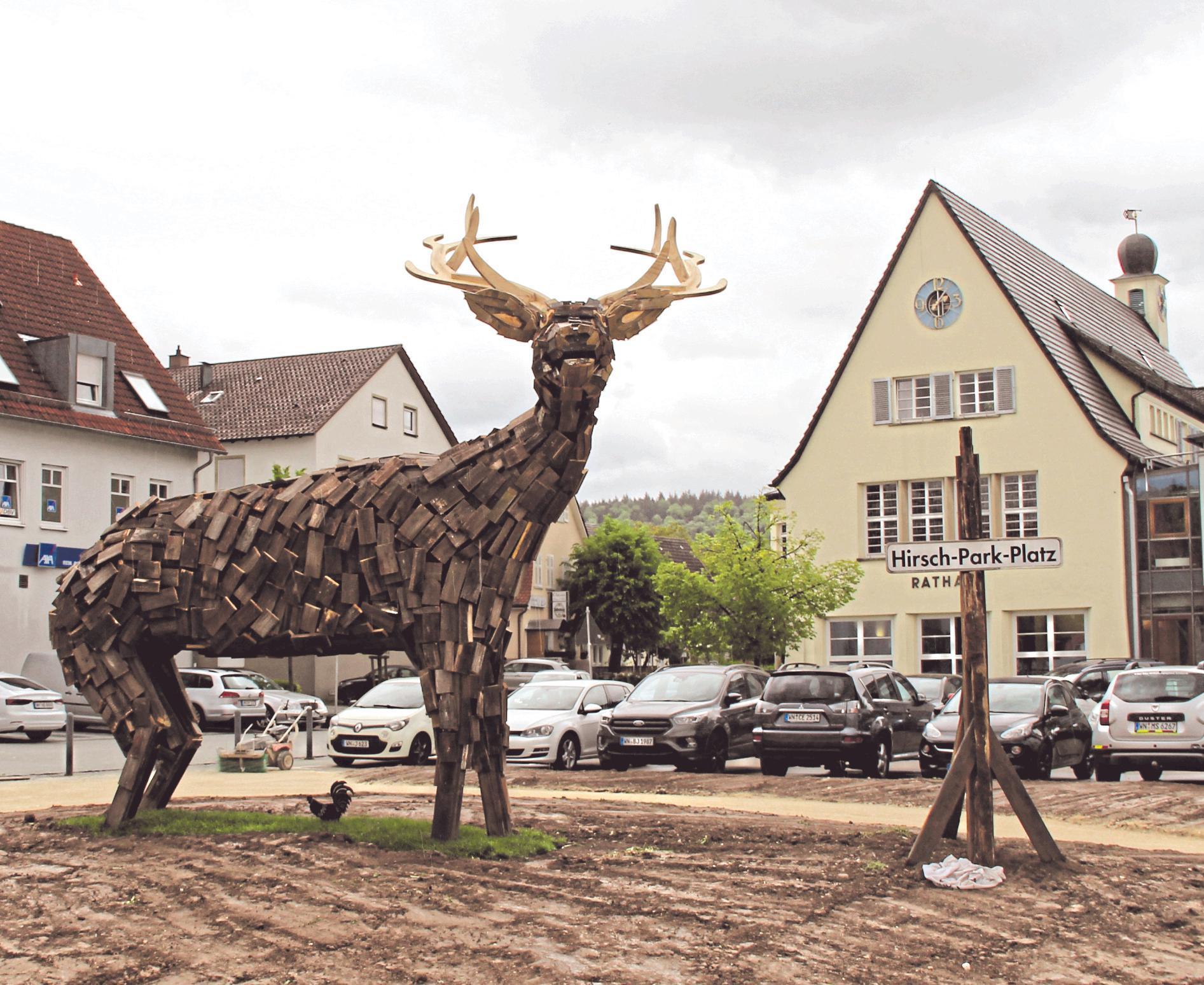 Mit einem eigens für diesen Zweck organisierten Kran wurde die Trophäe vom Gerüst heruntergeholt. Der Hirschkopf selbst hängt nun in der Holzwerkstatt Kiesewalter, wo auch die Einzelteile des hölzernen Tieres herstammen.