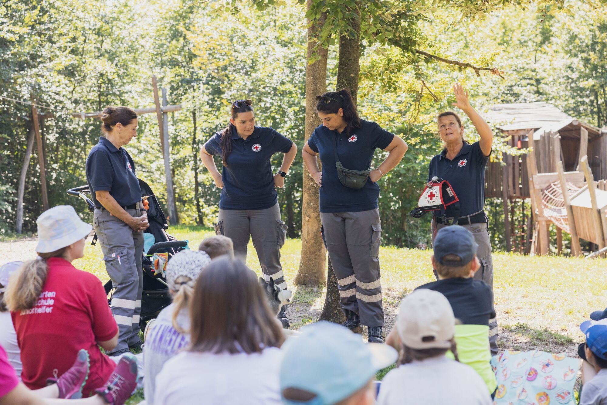 Drohnen schwirren über die Wiese und die Lautsprecher melden sich. „Hallo, hier ist die DRK-Drohnengruppe - Tatütata.“ Die Kinder heben die Köpfe, stellen sich unter die wirbelnden Propeller und genießen die Abkühlung. Normalerweise werden Drohnen bei der Vermisstensuche eingesetzt. Bei den JRK-Erlebnistagen in Urbach schauen verschiedene Spezialisten, von Hundestaffel bis Rettungsdienst, vorbei, um vorzustellen, was das DRK alles bietet. Drei spannende Tage erwarteten die