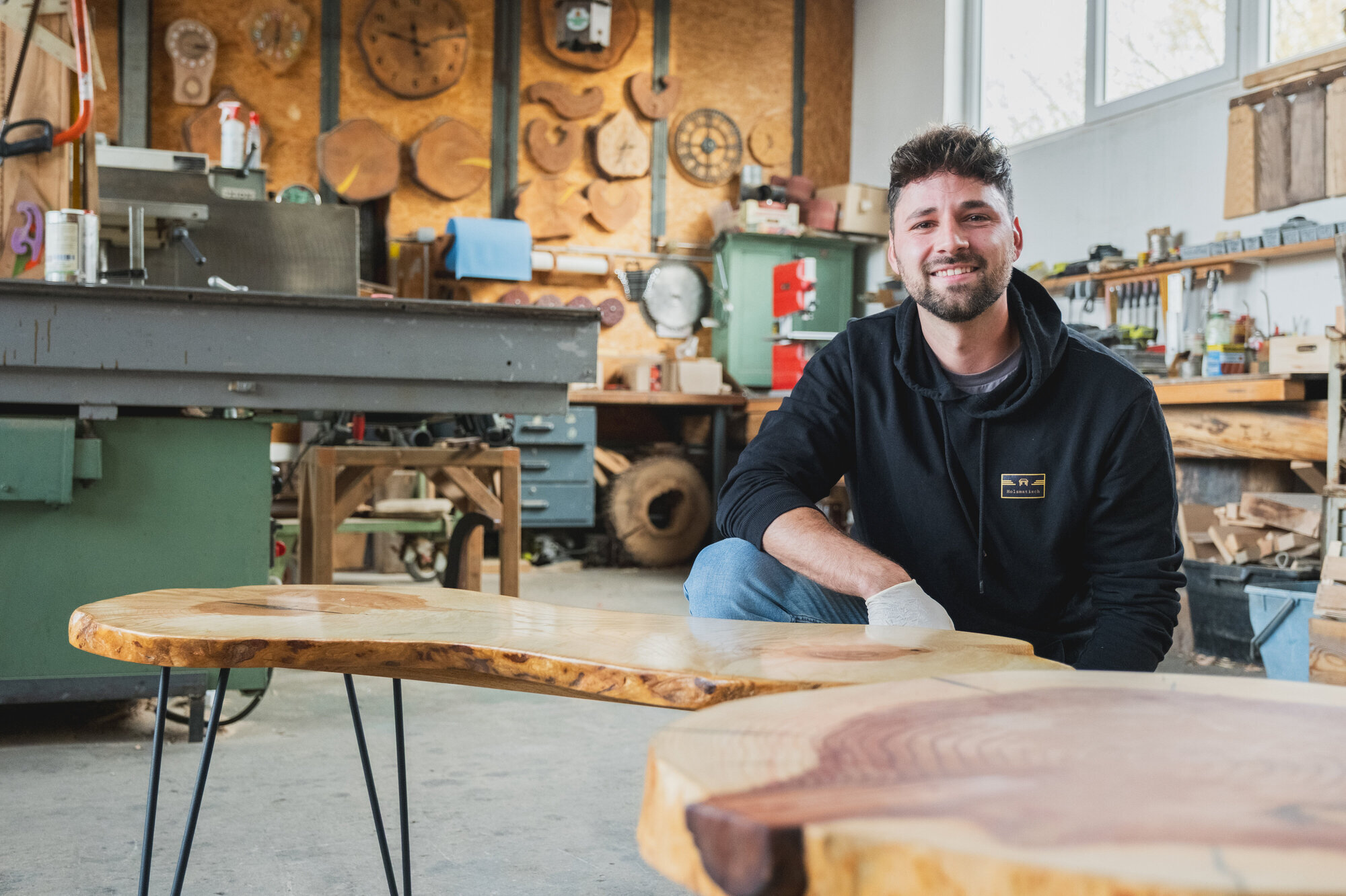 Urbach. Angefangen hat es, als Markus Schiek von zu Hause ausgezogen ist und einfach keinen passenden Esstisch in den Möbelhäusern gefunden hatte. Sein Vater schlug vor, doch selbst einen Tisch zu bauen. „Ein paar Bretter hatten wir noch da, das war der Startschuss“, erzählt Schiek im Gespräch mit den Schorndorfer Nachrichten. Das ist jetzt neun Jahre her und der 31-Jährige stellt immer noch Tische her, inzwischen unter seinem eigenen Label „Holzmatisch“.