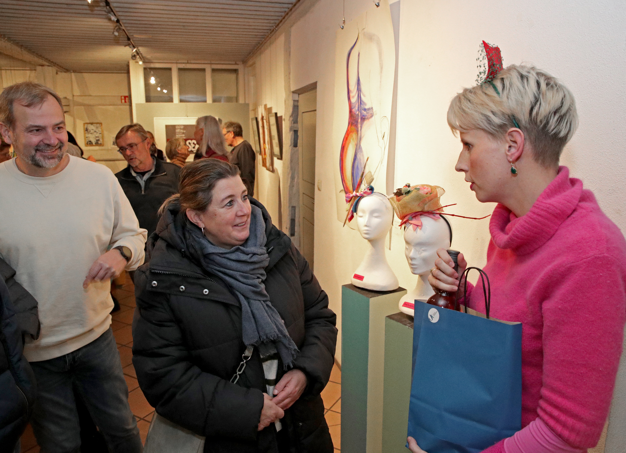 Und apropos Chapeau: Mit dem Hütchen hat ganz besonders Sandra Riegert so einiges am Hut. Ihre kecken Hutkreationen waren der unwiderstehliche Blickfang bei der Ausstellungseröffnung. Fantasievolle Objekt-Nester sind das, die jedem Auftritt ihrer Trägerin sozusagen die Krone